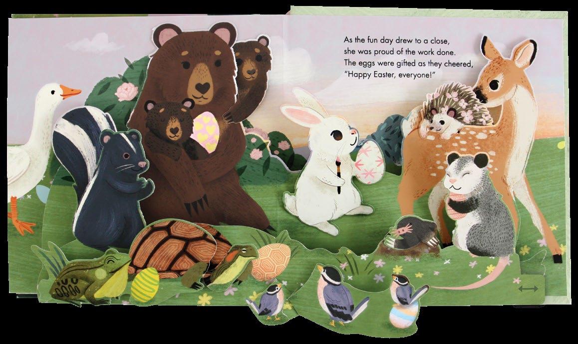 The Easter Bunny has a grand idea—she’ll paint her Easter eggs, inspired by the beautiful patterns and colors of her friends! She ventures through the forest and wetlands, gathering company as she travels. Together, the animal party makes Easter possible! This holiday adventure features six illustrated spreads filled with original pop-ups, hidden flaps, and charming surprises.
