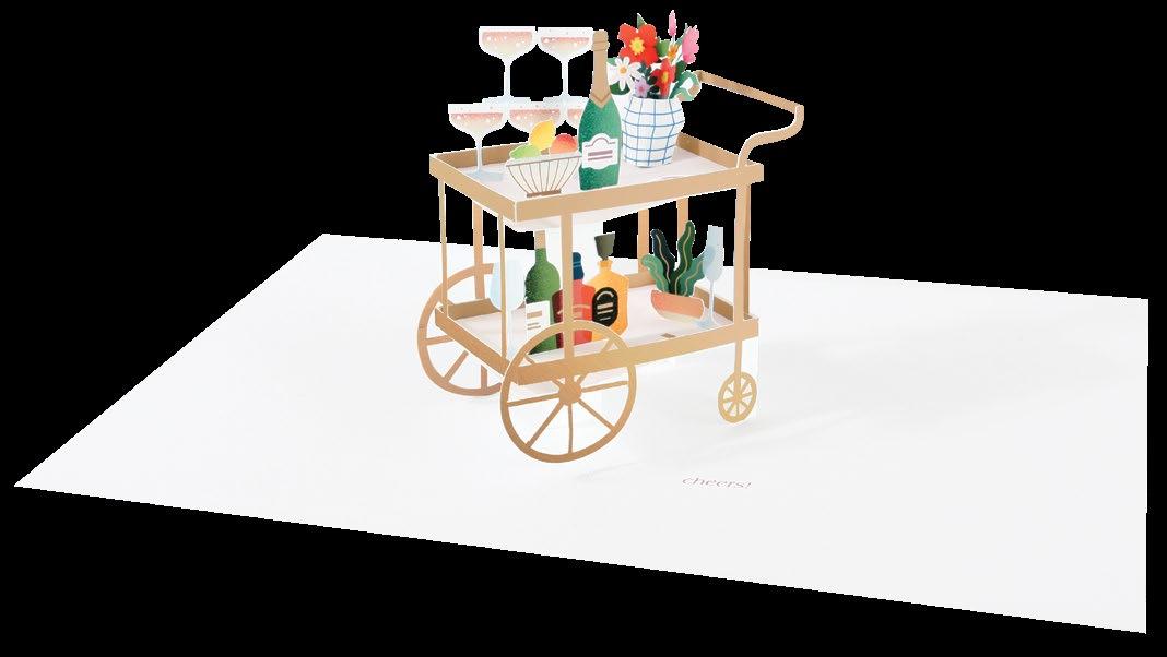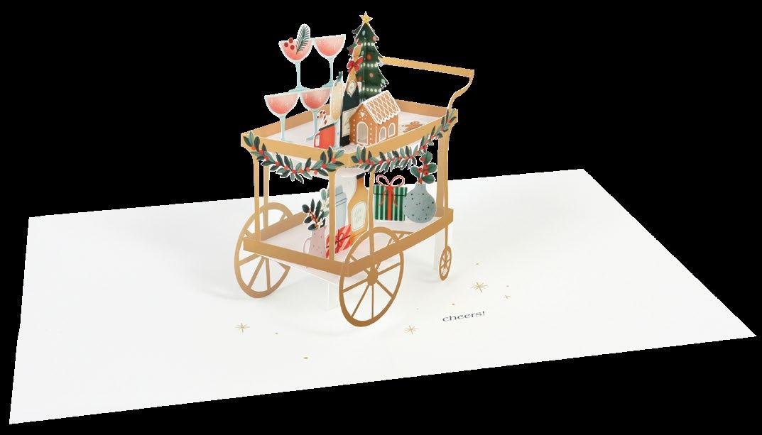 A gilded cart is laden with Christmas treats and holiday spirits.