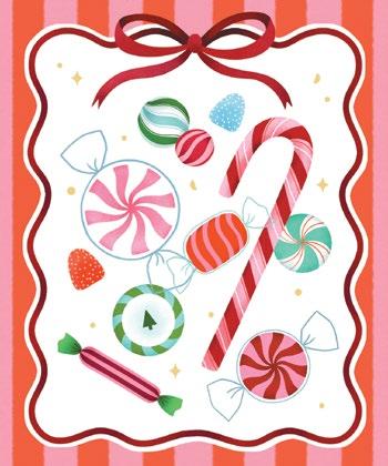 Handfuls of brightly-illustrated Christmas sweets twirl together.