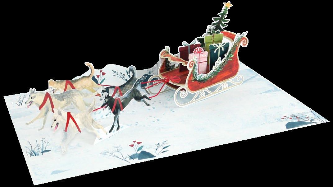 Winter dogs prance through the snow, pulling Santa's sleigh filled with gifts.