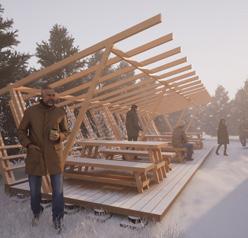 Tímový projekt Drevený lounge bol koncipovaný ako spolupráca s firmou Seca, fínskou školou Centria a našimi konštruktérmi, čím nadobudol rozmer medzinárodného dialógu. Tvarovú inšpiráciu pre lavičky a stoly sme našli v neďalekom tajchu Červená studňa, konkrétne ide o kombináciu šikmých drevených dielcov a kovových uholníkov. Novovzniknutý exteriérový nábytok tak citlivo reaguje na oblasť, v ktorej sa nachádza. Pri navrhovaní nadstrešenia – pergoly – sme dbali na to, aby svojím atypickým tvarovaním dotvárala existujúci charakter areálu a stala sa nielen funkčným, ale aj estetickým prvkom. Výsledkom je spoločenský priestor v kultúrno-turistickom centre Hájovňa pri Banskej Štiavnici, ktorý skutočne láka k zastaveniu, rozhovoru a zážitku.