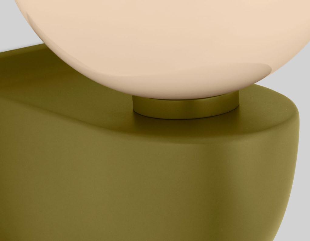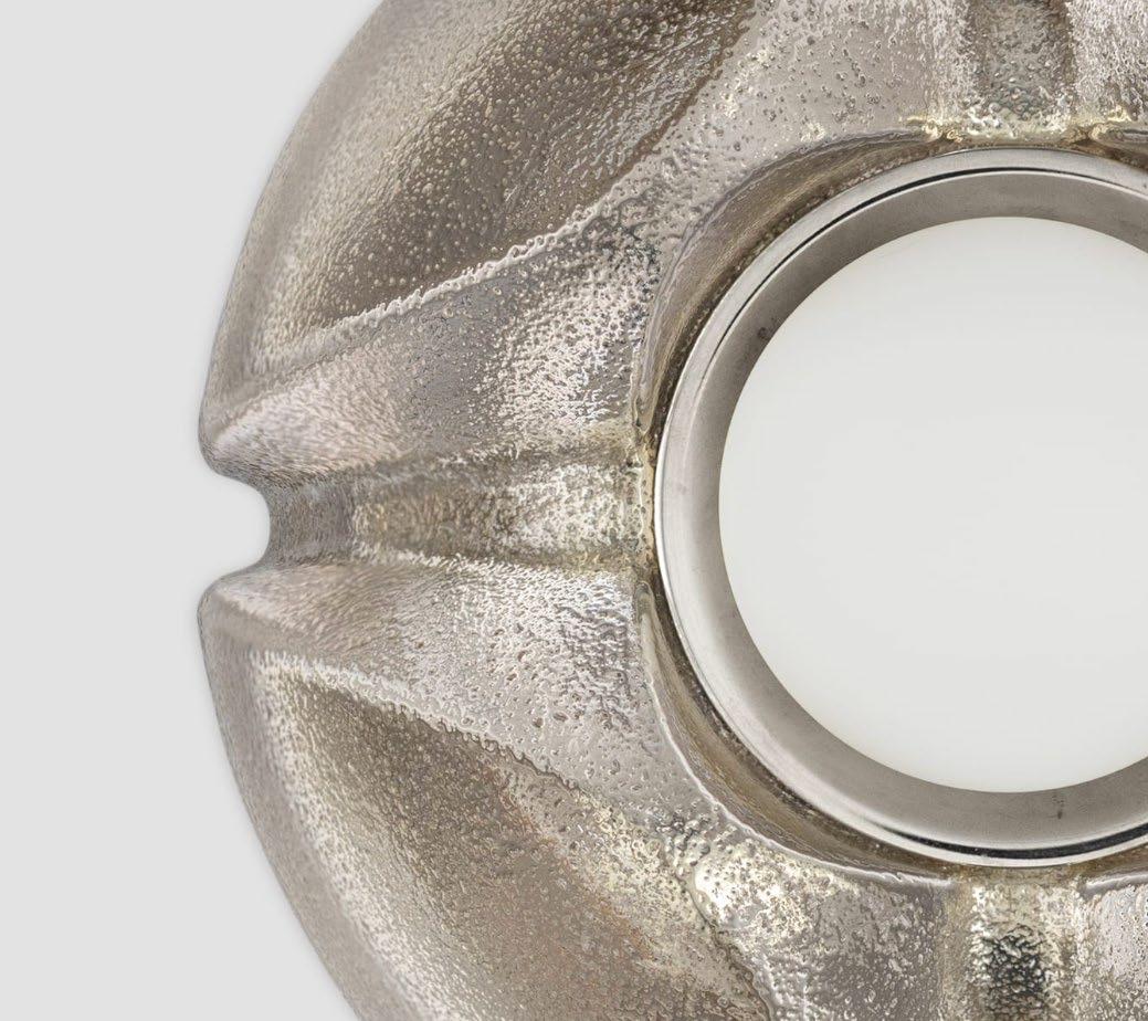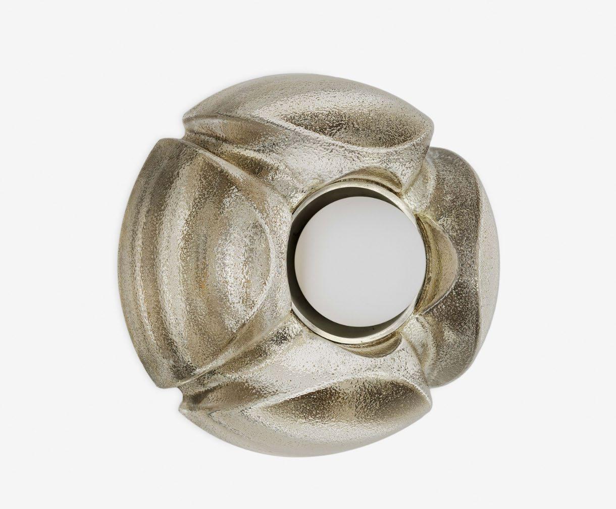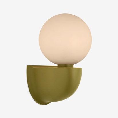 A molded brass body recalling the hull of a ship pairs with an opaque glass globe for a nautical-inspired sconce. For more details, click here.