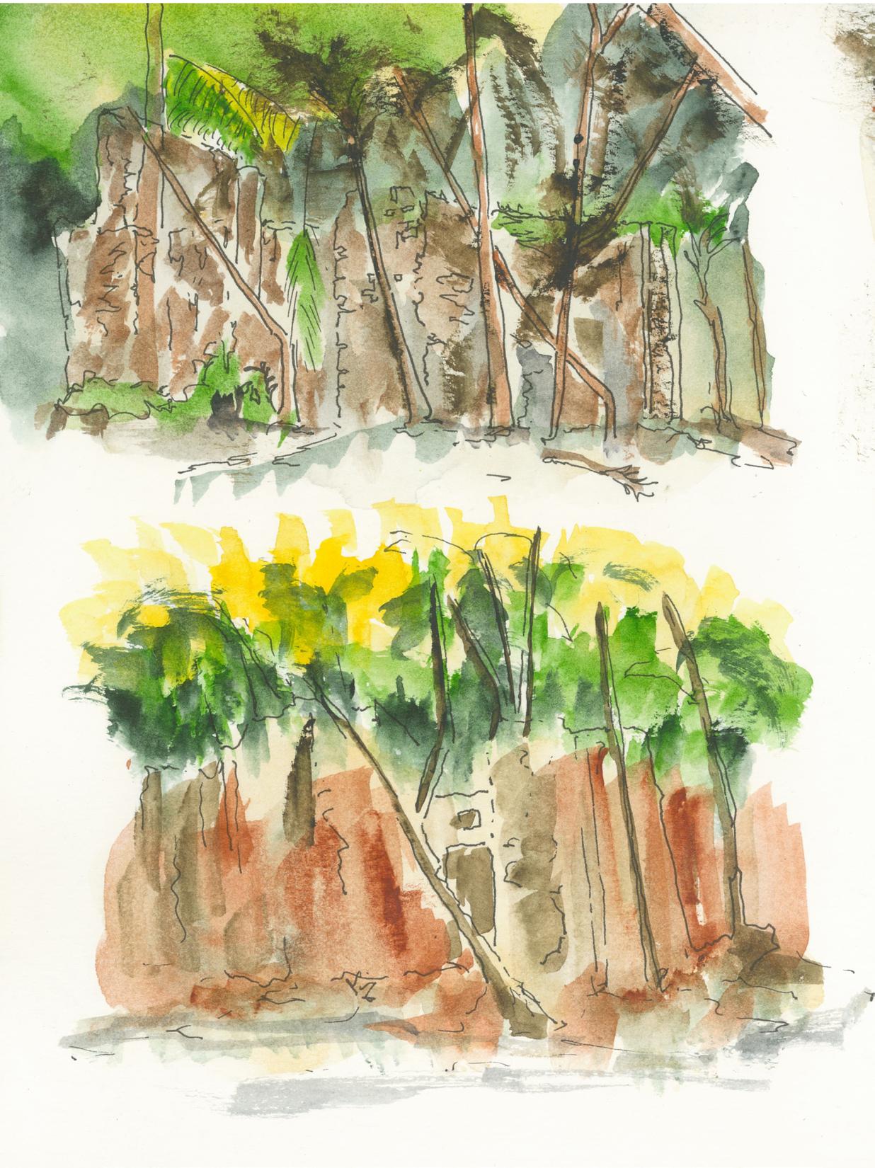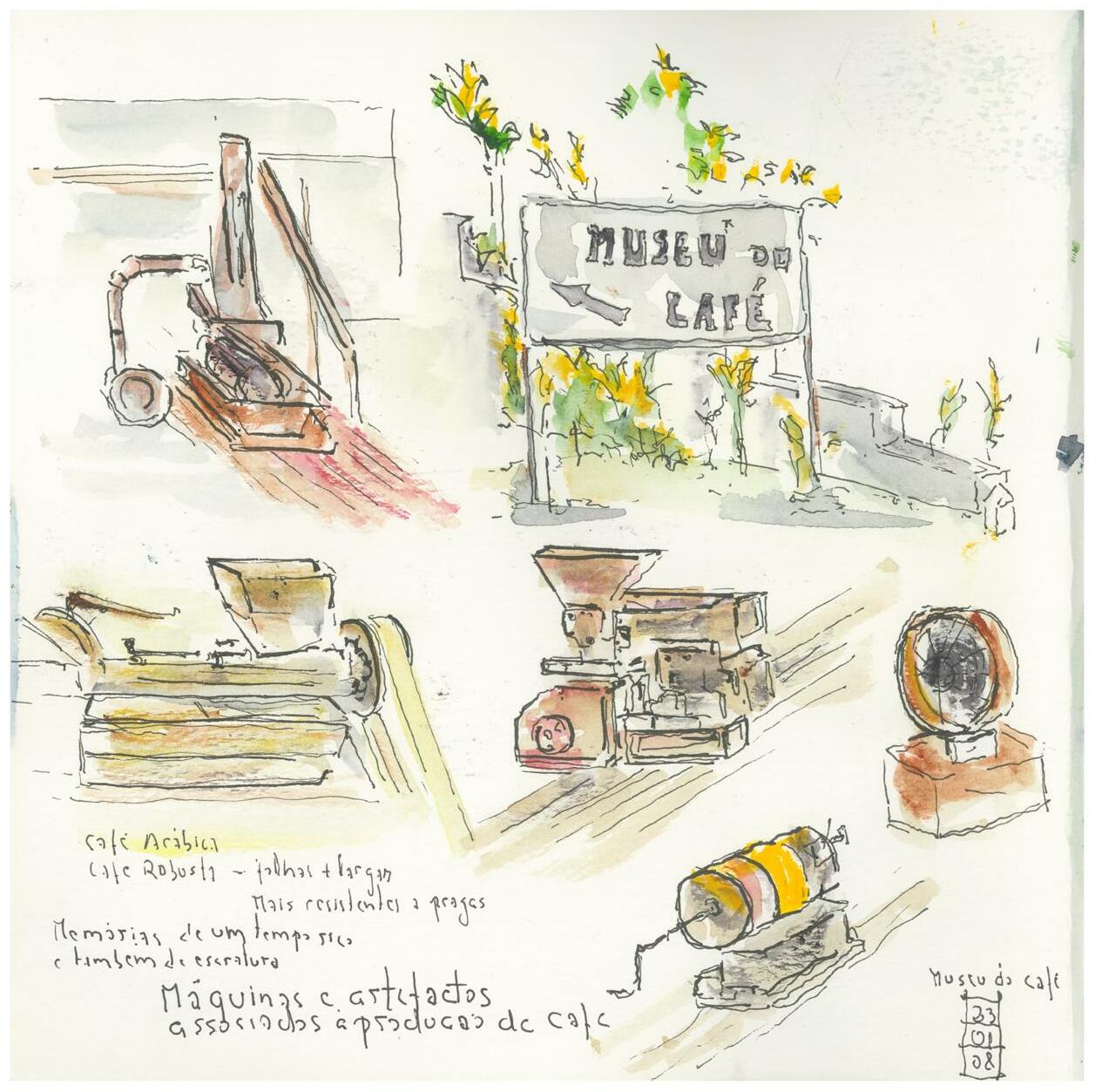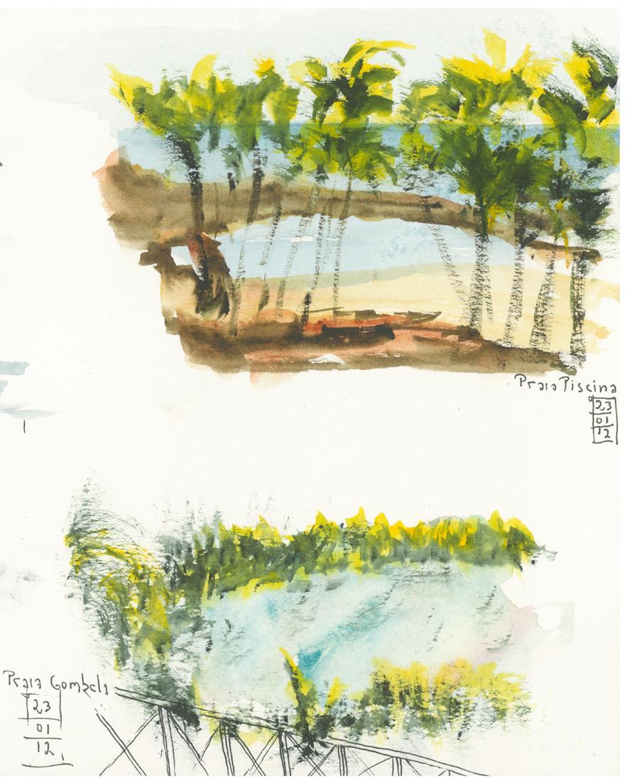 A roça Belmonte é hoje um hotel de charme, com vista sobre a praia Banana onde a cor da água não cabe nas minhas aguarelas. Mergulhamos e visitamos o museu, dedicado à fauna e flora locais.