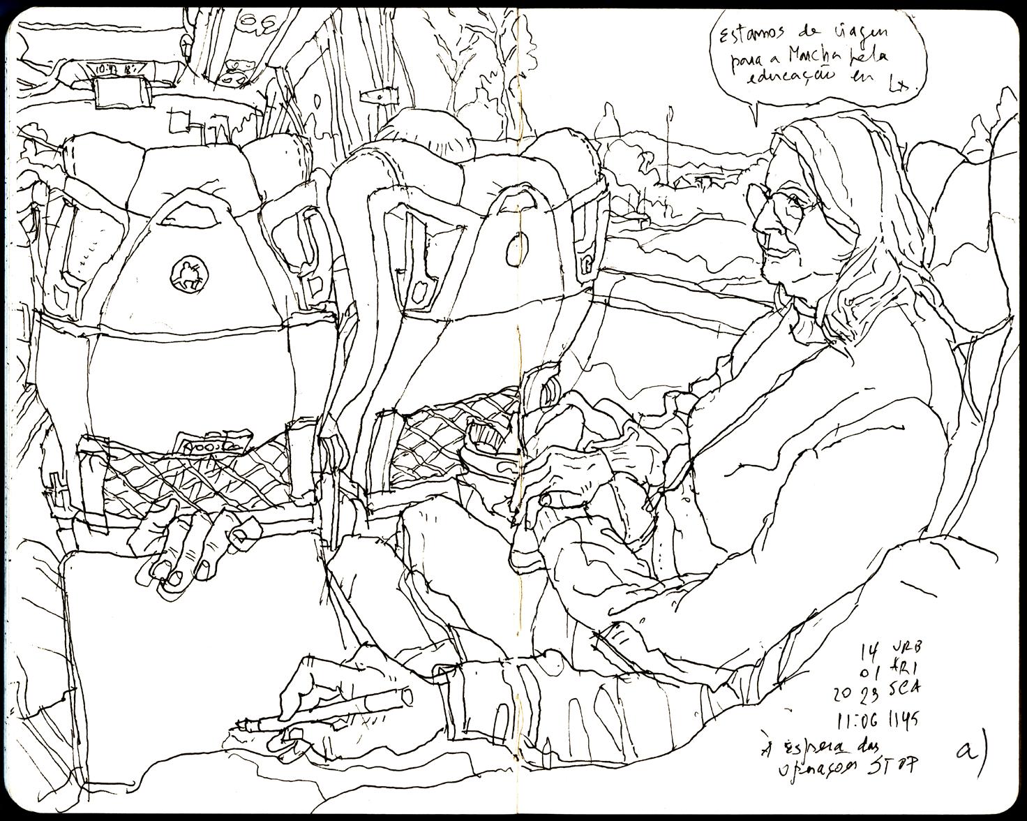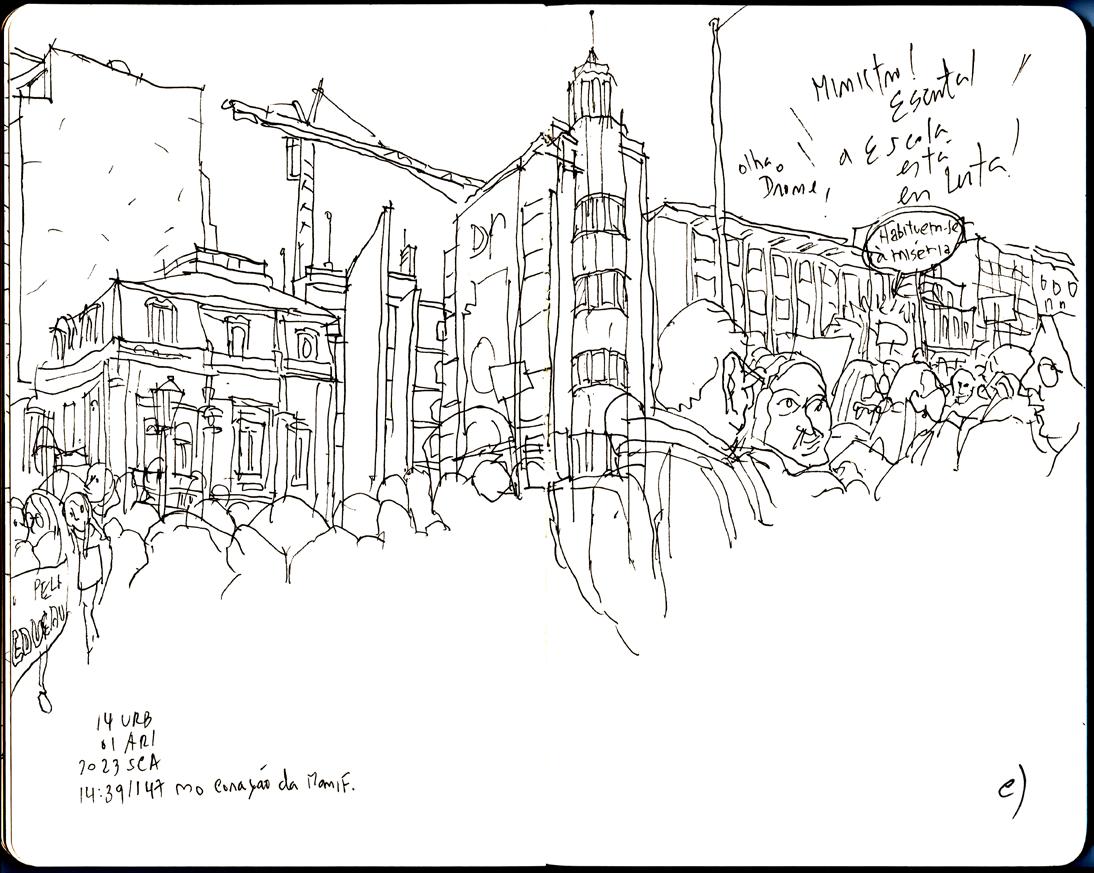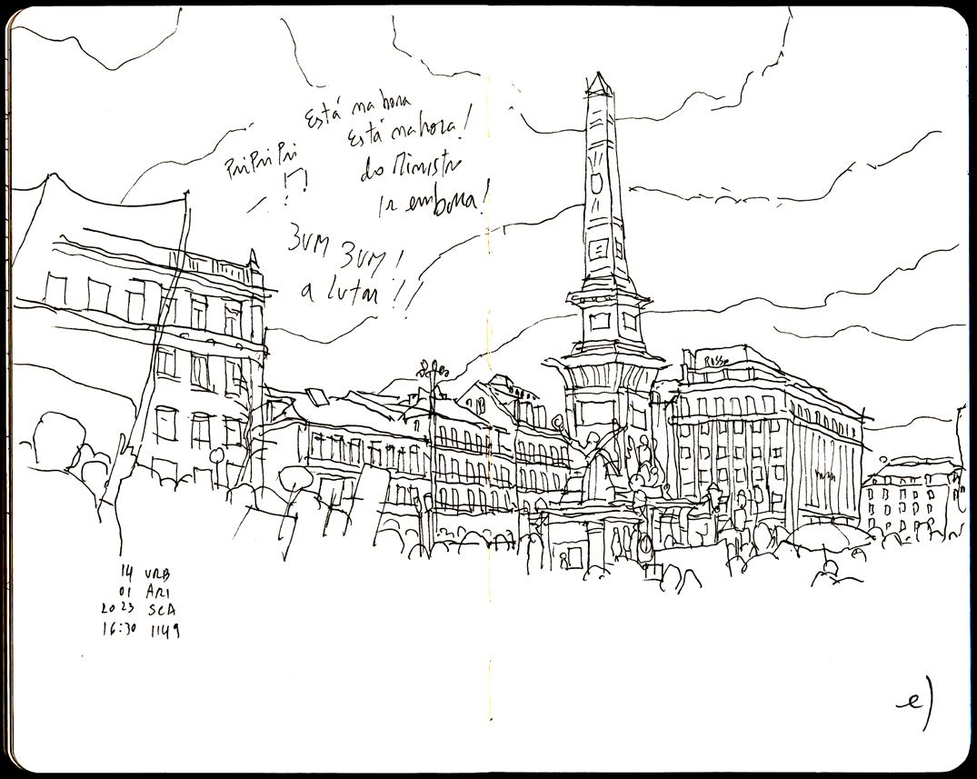 Acabo o desenho às 14:39. No mesmo local e para o lado direito, risco mais outro. São 15:11. Drones passam, gritos de protesto e lenços brancos furiosos no ar. A marcha arranca. Com licença, deixe passar. Libertamo-nos do centro da confusão. Vamos mais para a frente. Acompanhamos pelas margens da Avenida, pelo passeio e quase atropelo um polícia. Olha para mim furibundo. Na Cabeça da Marcha, três enormes faixas, amarelas e brancas. “A Lutar também estamos a Ensinar”. O André e o João vão debitando frases. – “Nós queremos usar toda a nossa força no trabalho, na Escola e nos nossos alunos.” – “É a Escola, são os nossos alunos, aquilo o que nos traz aqui. “Escola sim, cunhas não!!!”. –Chegamos aos Restauradores.