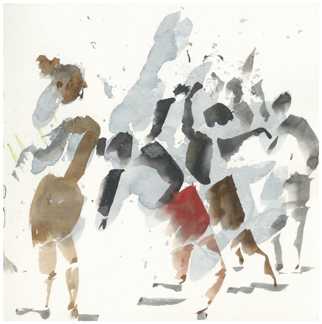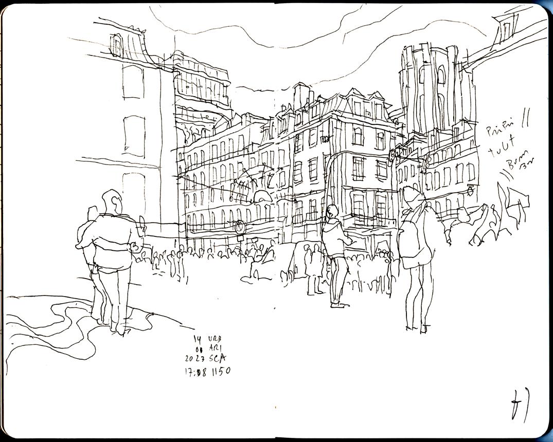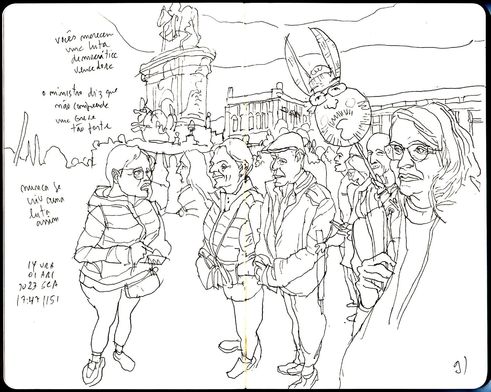 (g) Seguimos pela rua do Ouro. Fugimos à rua do Ouro. A rua Augusta está livre. Passamos o Arco do Triunfo e o Terreiro do Paço recebe-nos. –- Fiquemos aqui no meio. Olho em volta, respiro fundo. – Lá vou ter que desenhar mais um. Vai ser o último. Este é diferente. Registo as caras, a Ana, uma relação de proximidade, no coração do evento. Ao longe, André Pestana discursa… Um colega com um cartaz, a cabeça de João Costa, o Ministro e com orelhas de burro. É um sucesso. Fotos e mais fotos. Desenho-o.