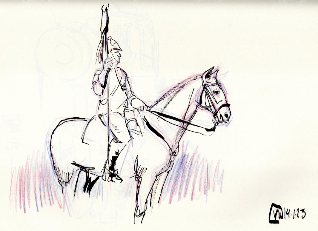 tugueses e espanhóis, por iniciativa dos USk Raia (de Elvas), Badajoz e Cáceres. Além dos sketchers daquela cidade alentejana, o evento contou com a participação de desenhadores oriundos de Évora, Castelo Branco, Azeitão, Lisboa, Badajoz, Cáceres, Mérida, Sevilha, Córdoba, Madrid e Maiorca. Os desenhos incidiram sobre a parada militar, a antiga Sé e o Castelo de Elvas. Esta foi uma excelente oportunidade para praticar o desenho de modelo humano e de animais - graças aos militares e cavalos da GNR -, bem como naturezas mortas (viaturas militares), tendo abrangido todos os momentos da parada e o desfile que se lhe seguiu.