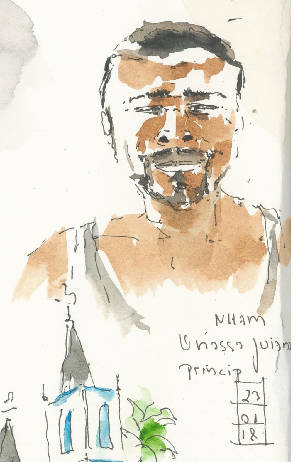 leva a irmã a escola…A vida é cheia de problemas, fala, nada é perfeito e ela também não, mas ”as mulheres aqui não desistem, são muito lutadoras” . Diz que é feliz … porque ama tudo o que faz e tudo o que faz é com muito amor! O Príncipe é mágico. Em S. Tomé, recuperamos o nosso tuk-tuk driver dos primeiros dias. Museu do forte, a história de São Tomé, das roças, dos escravos, da libertação, da independência. O mercado, a biblioteca e o arquivo nacionais. A CACAU que promove e expõe a arte, a cultura e a história locais. Leve-leve, mole-mole… Está um calor de morrer.