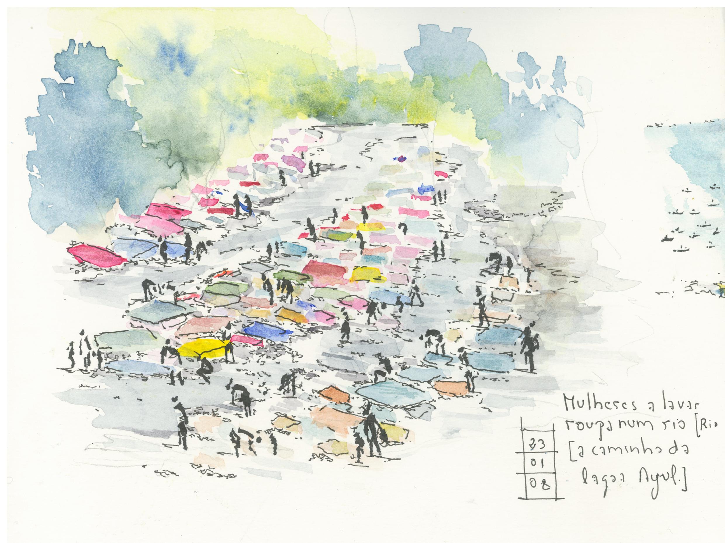 (f) Seguimos para o Rossio. Novo poiso, volto a riscar. Primeiro a construção como fundo. Mil selfies para aqui e para ali, casais e carrinhos de bebé, gente que assiste. – A Maria João conta as peripécias pelas quais passou nos recentes e seus primeiros dias de aula/ substituição de colega de atestado, surreal. A MJ tem 55 anos. E sobre os concursos? Diz ter telefonado para a escola. – Colega, escusa de concorrer para esta vaga pois o processo está a ser formalizado para que entre uma professora que já cá está. - Como? ... Adiante. Acabo este às 17:08.