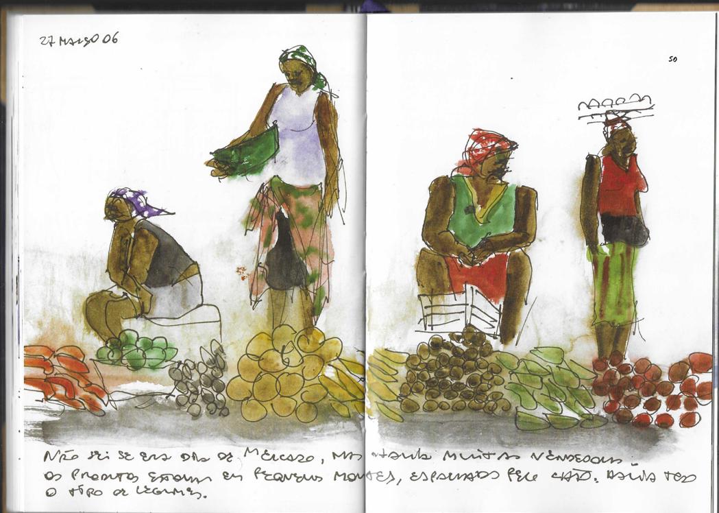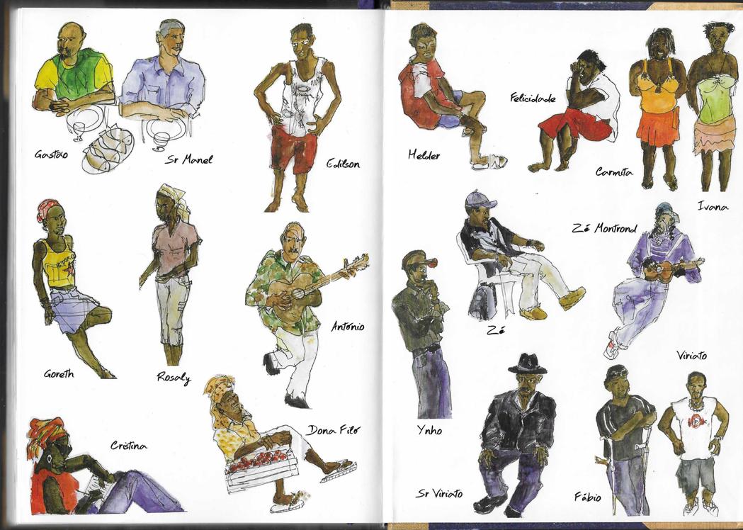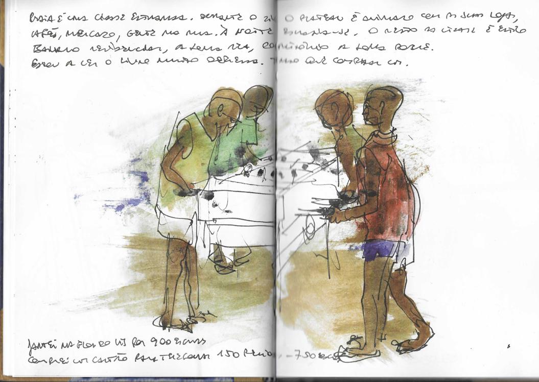 A beleza do livro para mim reside no retrato do quotidiano, de situações corriqueiras do povo que circula nas ruas, vendedoras ambulantes ou miúdos a jogar à bola. Com poucos desenhos de edifícios, mais paisagens, a descontração de músicos a actuar ou passageiros à espera de transporte. Gosto do traço solto e inconfundível do Eduardo. Os apontamentos são rápidos na caligrafia dele (no final do livro estão todas as transcrições) e são os registos que qualquer um de nós faz numa viagem com alguns pensamentos fruto da disposição ou momentos de espera. O livro apresenta os desenhos