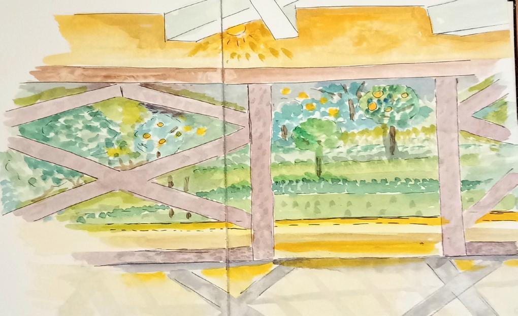 regressar. Os sketchers participantes ficaram distribuídos entre os espaços interiores, compostos por vários claustros e jardins interiores, e a envolvente exterior do jardim circundante, com espaços variados onde muitos optámos por desenhar, porque havia algumas limitações de ocupação no interior devido a muitas atividades que decorriam ao mesmo tempo, nomeadamente visitas oficiais esperadas.