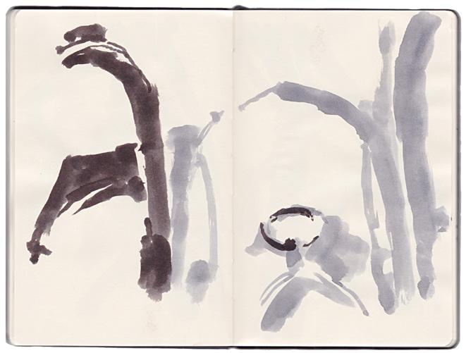 Materiais: caderno A5 e canetas de água, uma com ecoline warm grey e outra com black, ambas puras (não diluídas em água).