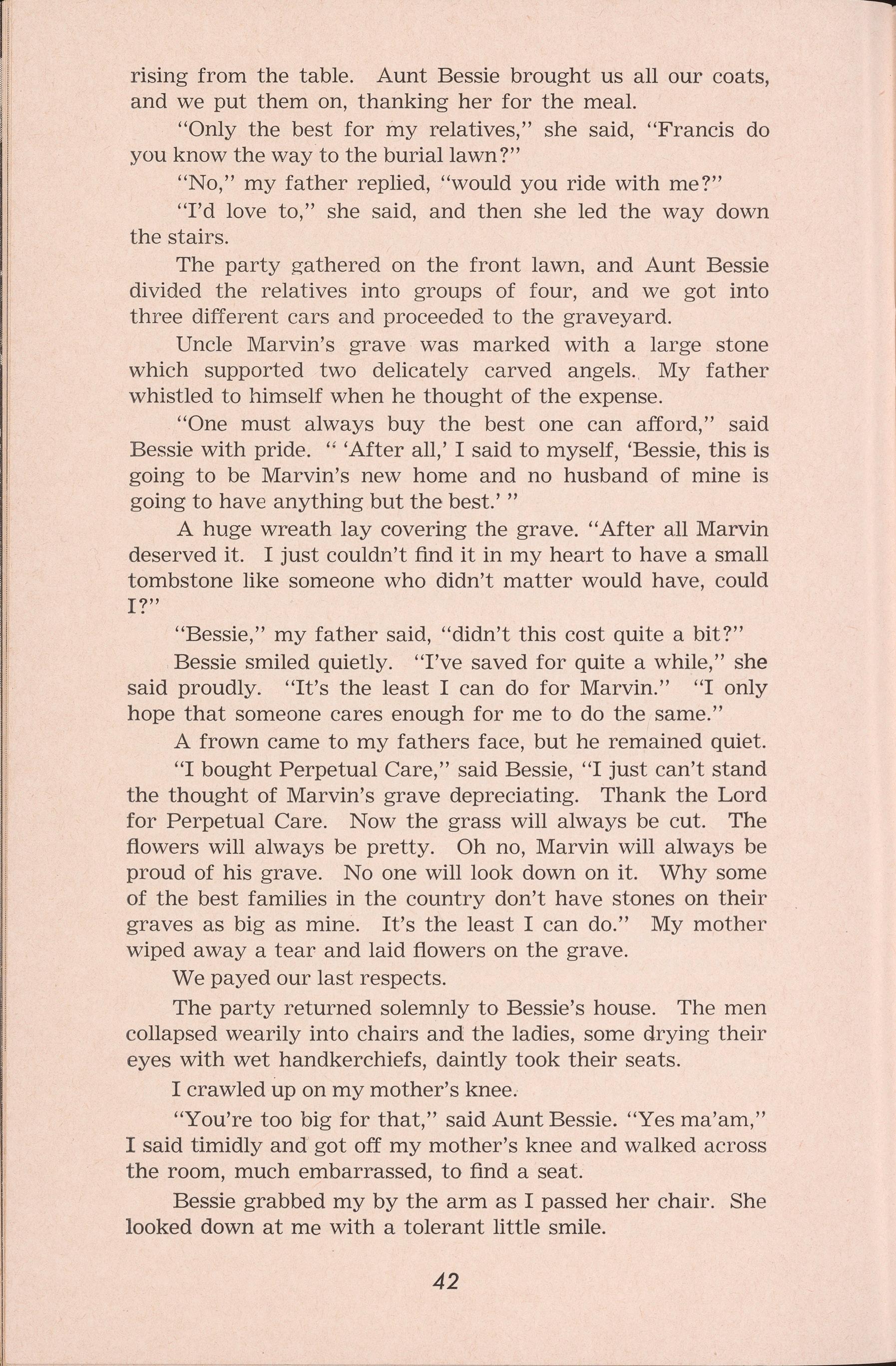 "I bought Perpetual Care," said Bessie, "I just can't stand the thought of Marvin's grave depreciating. Thank the Lord for Perpetual Care. Now the grass will always be cut. The flowers will always be pretty. Oh no, Marvin will always be proud of his grave. No one will look down on it. Why some of the best families in the country don't have stones on their graves as big as mine. It's the least I can do." My mother wiped away a tear and laid flowers on the grave.