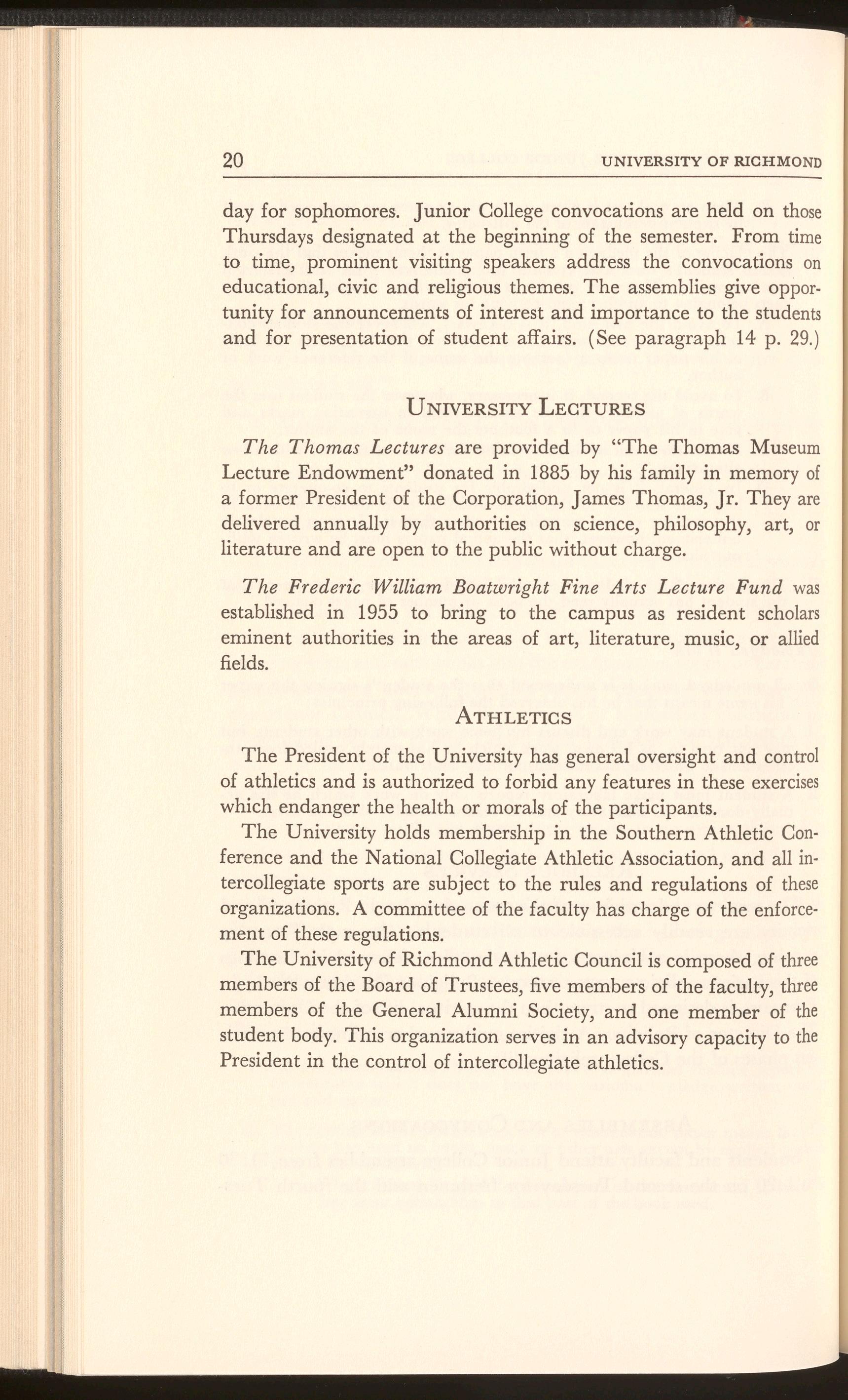 The University of Richmond, related to the Baptist General Association of Virginia, strives to provide a challenging and comprehensive academic program in a Christian atmosphere in which students of all faiths may apply themselves individually and collectively to developing their intellectual, spiritual, social, and physical potentialities. It seeks to give each student an intellectual experience that will widen his vision, deepen his faith, strengthen his character, and equip him to think and act rationally in our complex society. It fosters intellectual understanding, it defends freedom of discussion, and it promotes an objective search for truth; for without these conditions true education does not exist.