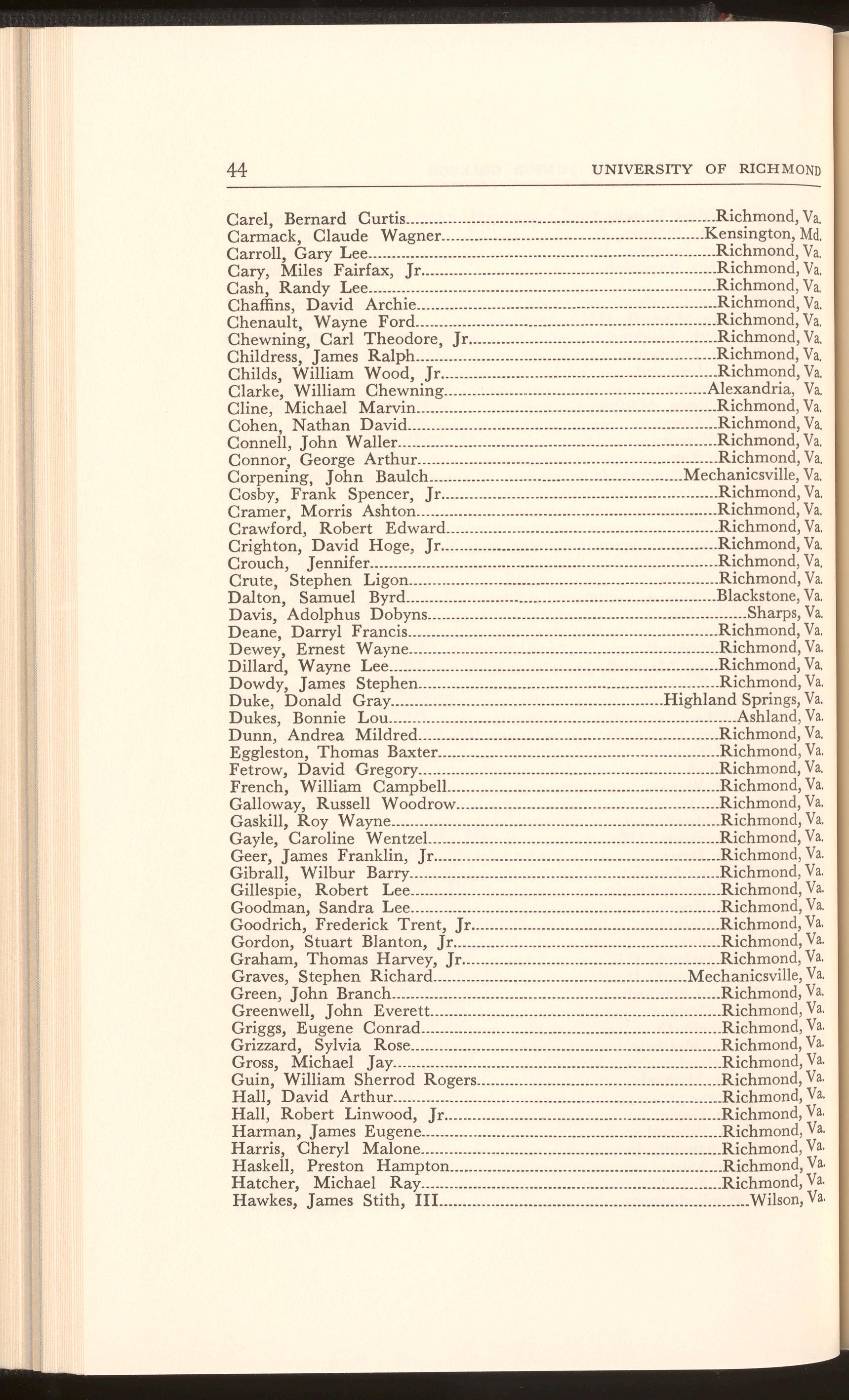 Carel, Bernard Curtis .................................................................. Richmond, Va. Carmack, Claude Wagner ........................................................ Kensington, Md. Carroll, Gary Lee .......................................................................... Richmond, Va. Cary, Miles Fairfax, Jr ............................................................... Richmond, Va. Cash, Randy Lee ................................................. ........... Richmond, Va. Chaffins, David Archie ................................................................ Richmond, Va. Chenault, Wayne Ford ................................................................ Richmond, Va. Chewning, Carl Theodore, Jr ..................................................... Richmond, Va. Childress, James Ralph ................................................................ Richmond, Va. Childs, William Wood, Jr ........................................................... Richmond, Va. Clarke, William Chewning ........................................................ Alexandria , Va. Cline, Michael Marvin ................................................................ Richmond , Va. Cohen, Nathan David .......................................................... .. .. .... Richmond, Va. Connell, John Waller .................................................................... Richmond, Va. Connor, George Arthur ................................................................ Richmond, Va. Corpening, John Baulch ...................................................... Mechanicsvill e, Va. Cosby, Frank Spencer, Jr ........................................................... Richmond, Va. Cramer, Morris Ashton ................................................................ Richmond, Va. Crawford, Robert Edward .......................................................... Richmond, Va. Crighton, David Hoge, Jr ........................................................... Richmond, Va. Crouch, Jennifer ....................................... ................................ Richmond , Va. Crute, Stephen Ligon .................................................................. Richmond, Va. Dalton, Samuel Byrd ................................. .............................. Blackstone , Va. Davis, Adolphus Dobyns .................................................................... Sharps, Va. Deane, Darryl Francis .................................................................. Richmond, Va. Dewey, Ernest Wayne .................................................................. Richmond, Va. Dillard, Wayne Lee ...................................................................... Richmond, Va. Dowdy, James Stephen ................................................................ Richmond, Va. Duke, Donald Gray .......................................................... Highland Springs, Va. Dukes, Bonnie Lou .......................................................................... Ashland , Va. Dunn, Andrea Mildred ................................................................ Richmond, Va. Eggleston, Thomas Baxter ............................................................ Richmond, Va. Fetrow, David Gregory ................................................................ Richmond, Va. French, William Campbell. .................... ....... .............................. Richmond, Va. Galloway, Russell Woodrow ........................................................ Richmond, Va. Gaskill, Roy W ayne ......................................................... .. .......... Richmond, Va. Gayle, Caroline Wentzel.. ............................................................ Richmond, Va. Geer, James Franklin, Jr ............................................................. Richmond , Va. Gibrall, Wilbur Barry .................................................................. Richmond , Va. Gillespie, Robert Lee .............................. . ... .... ............................ Richmond, Va. Goodman, Sandra Lee .................................................................. Richmond, Va. Goodrich, Frederick Trent, Jr .................................................. .. .Richmond , Va. Gordon, Stuart Blanton, Jr ..... .................................................... Richmond, Va. Graham, Thomas Harvey, Jr ....................................................... Richmond, Va. Graves, Stephen Richard ...................................................... Mechanicsville, Va. Green, John Branch ...................................................................... Richmond, Va. Greenwell, John Everett .............................................................. Richmond, Va. Griggs, Eugene Conrad ................................................................ Richmond, Va. Grizzard, Sylvia Rose .................................................................. Richmond, Va. Gross, Michael Jay ...................................................................... Richmond, Va. Guin, William Sherrod Rogers ........................... ........................ Richmond, Va. Hall, David Arthur ...................................................................... Richmond, Va. Hall, Robert Linwood, Jr ........................................................... Richmond, Va. Harman, James Eugene ................................................................ Richmond, Va. Harris, Cheryl Malone ................................................................ Richmond, Va. Haskell, Preston Hampton .......................................................... Richmond, Va. Hatcher, Michael Ray ................................................................ Richmond, Va. Hawkes, James Stith, 111.................................................................. Wilson, Va.