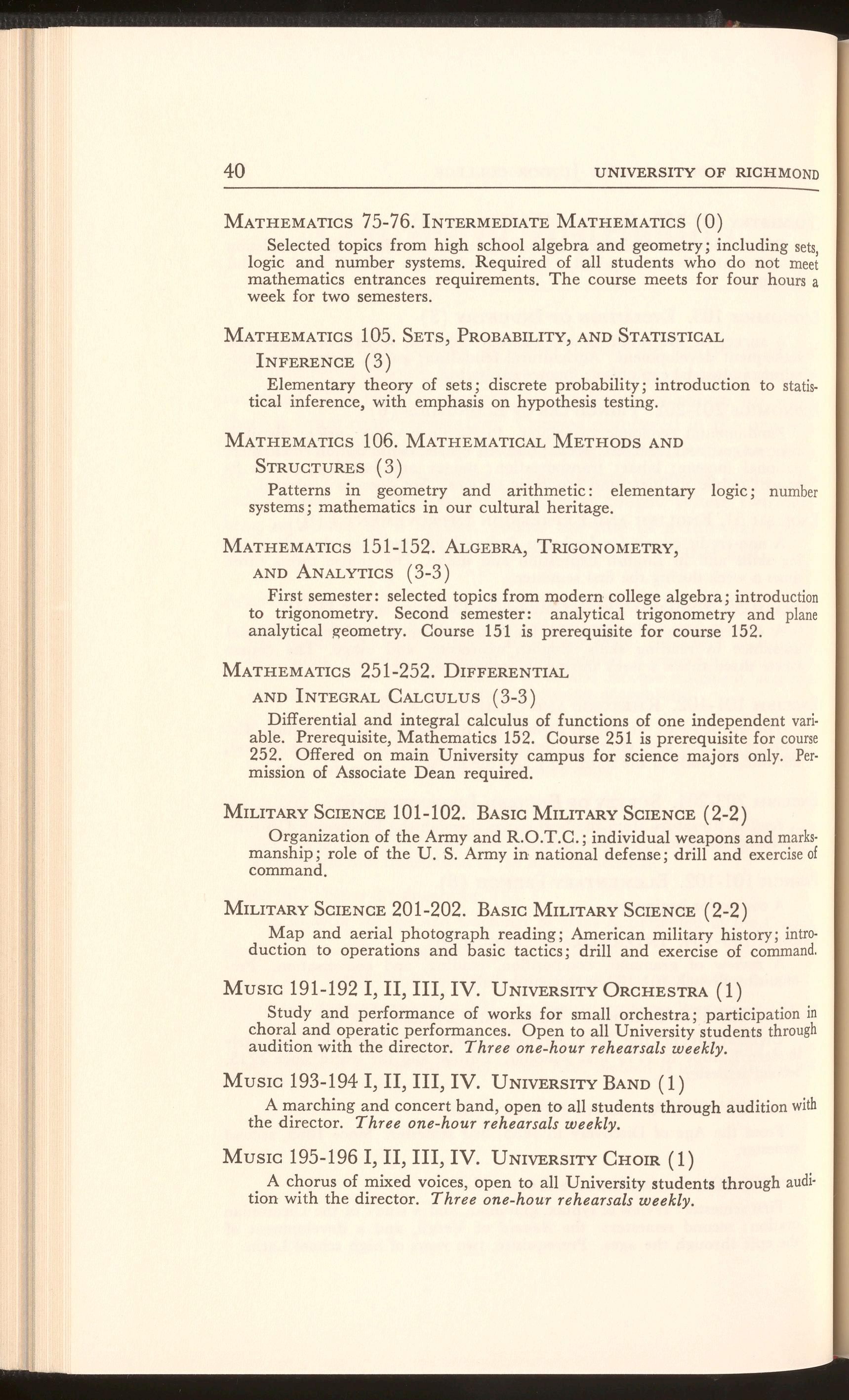 First semester : selected topics from modern college algebra; introduction to trigonometry. Second semester: analytical trigonometry and plane analytical geometry. Course 151 is prerequisite for course 152.