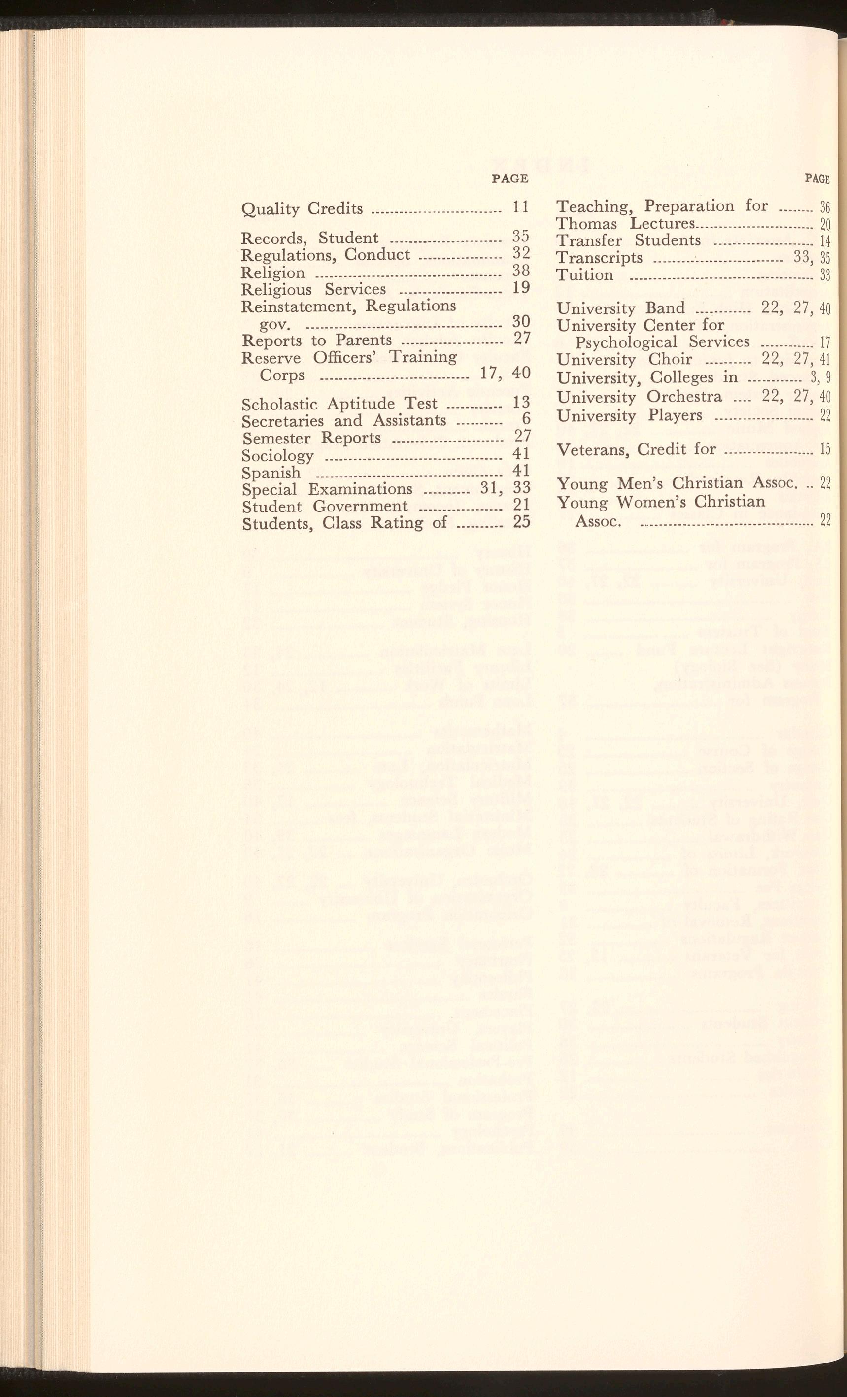 Entrance Requirements 13 Examinations, Special ................ 31 Expenses ...................................... 33 Extra-Curricula Activities .. 27, 31 Faculty of Instruction ................ 7 Faculty Adviser System ........... 16 Faculty Committees ............ 8 Fees ...................... ................. ... 33 Forensic Activities 23, 27 Fores try 3 6 French .......................................... 39 Freshman Orientation Program 16 Glee Club ...................... 22, 27, 40 Government, Student .................. 21 Grades, Incomplete .............. 3 1 Grading, Method of .................... 26 History .. ... ......... .... ............... 39 History of University 9 Honor Pledge ...................... 17 Honor System ...................... .... 17 Housing, Student ........................ 32 Late Matriculation 24, 33 Library Facilities ......... 12 Limits of Work ............ 12, 24, 30 Loan Funds .................................. 34 Mathematics ... 40 Matriculation .............................. 24 Matriculation, Late 24, 33 Medical Technology ............... .. . 36 Military Science .................. 17, 40 Ministerial Students, fees .......... 34 Modern Languages .............. 39, 40 Music Organizations .... 22, 27, 40 Orchestra, University .... 22 27 40 Organization of University '....... '. 9 Orientation Program 16 Personnel Services 16 Pharmacy .................................... 36 Philosophy .... 41 Physics 41 Placement .................................... 16 Players, University ............... 22 Political Science 41 Pre.Professional Studi es ...... 36, 37 Probation 31 Professional Studies ............ 36, 37 Program of Study ................ 36, 37 Psychology 41 Publications, Student .......... 21, 27