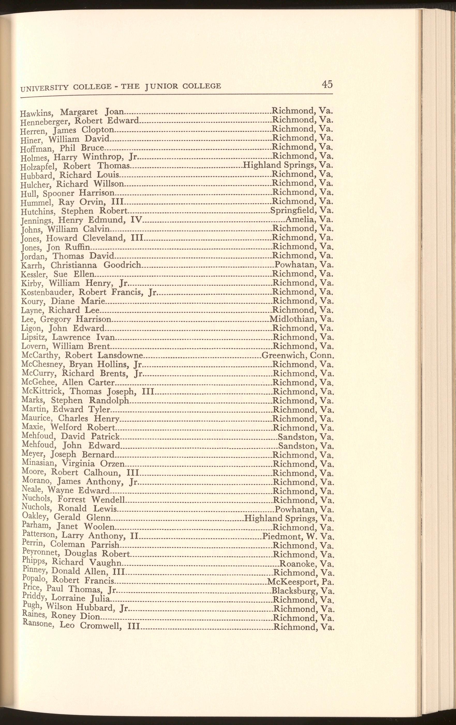 Hawkins Margaret Joan ............................................................ Richmond, Va. Henneb;rger Robert Edward ...................................................... Richmond, Va. Herren Jam'es Clopton Richmond, Va.
