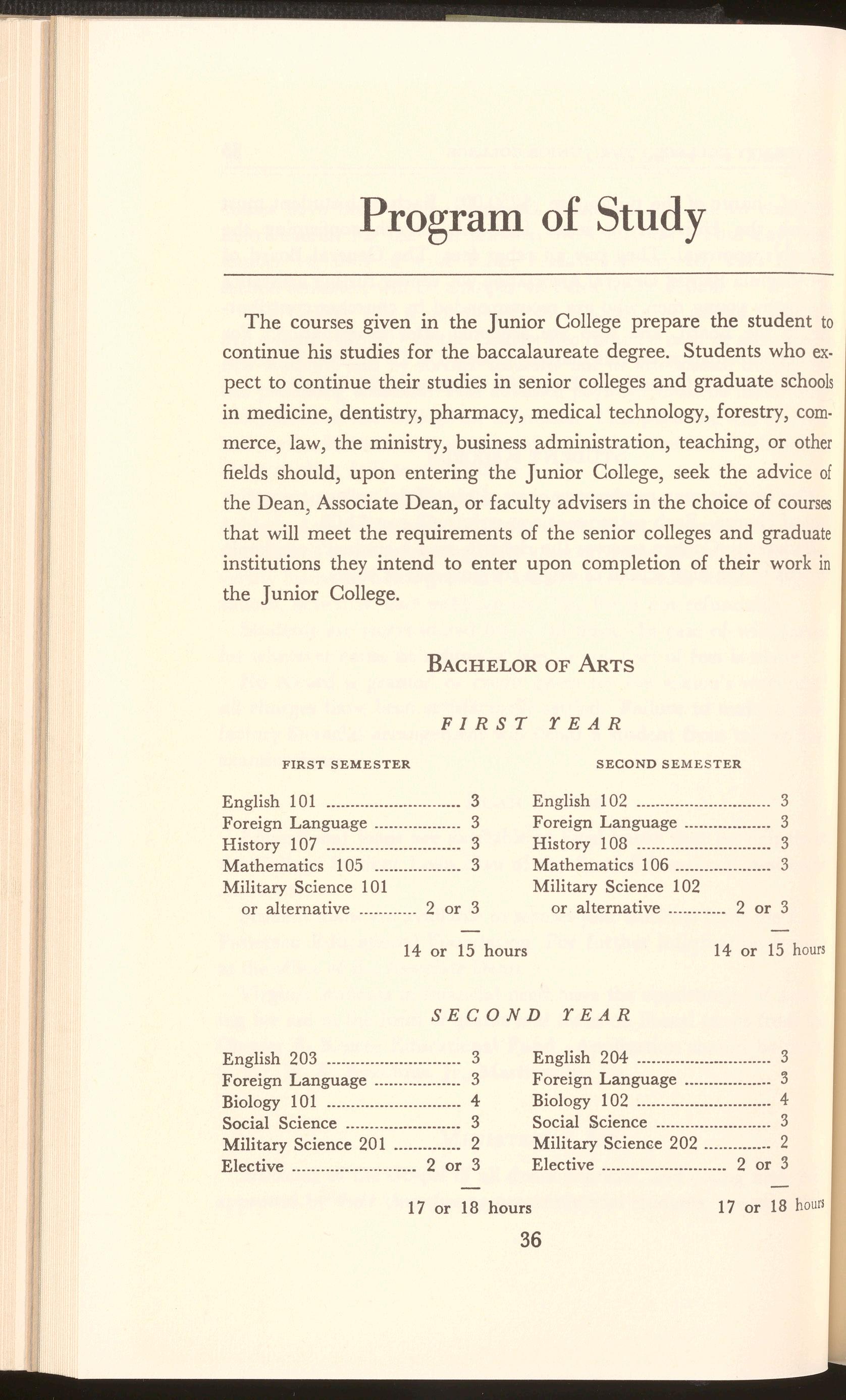 A student is required to take at least twelve hours of scholasti c work a week. Maximum class loads for freshman and sophomore students are those indicated in the "Program of Study" on pages 36-37. These loads may be exceeded only if the student maintaifll an average grade of "C" or better. No student may take more than sixteen hours of work per week exclusive of military science withoul special permission from the Dean.