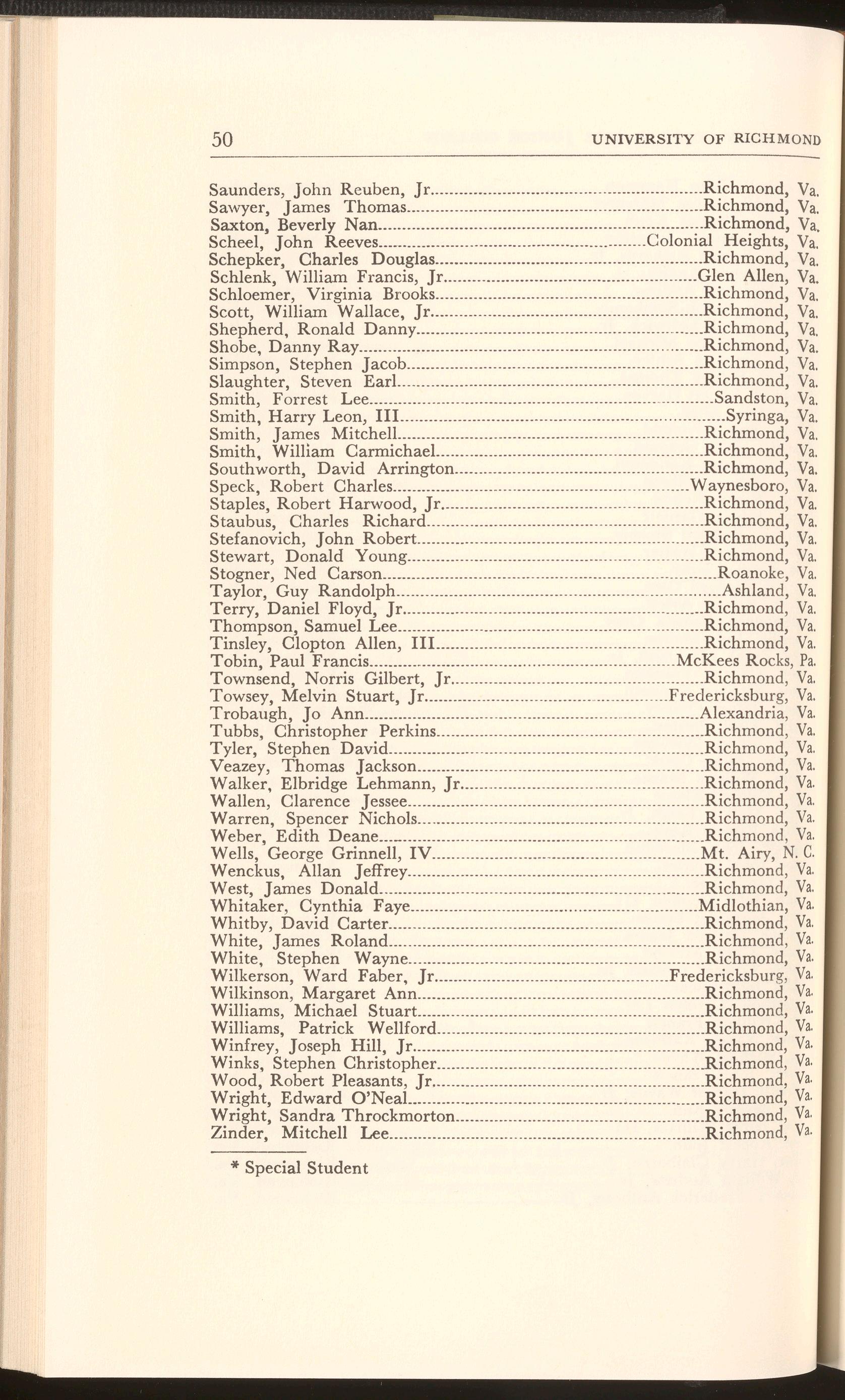 Wright, Edward O'Neal.. Richmond, Va. Wright, Sandra Throckmorton Richmond, Va. Zinder, Mitchell Lee Richmond, Va.