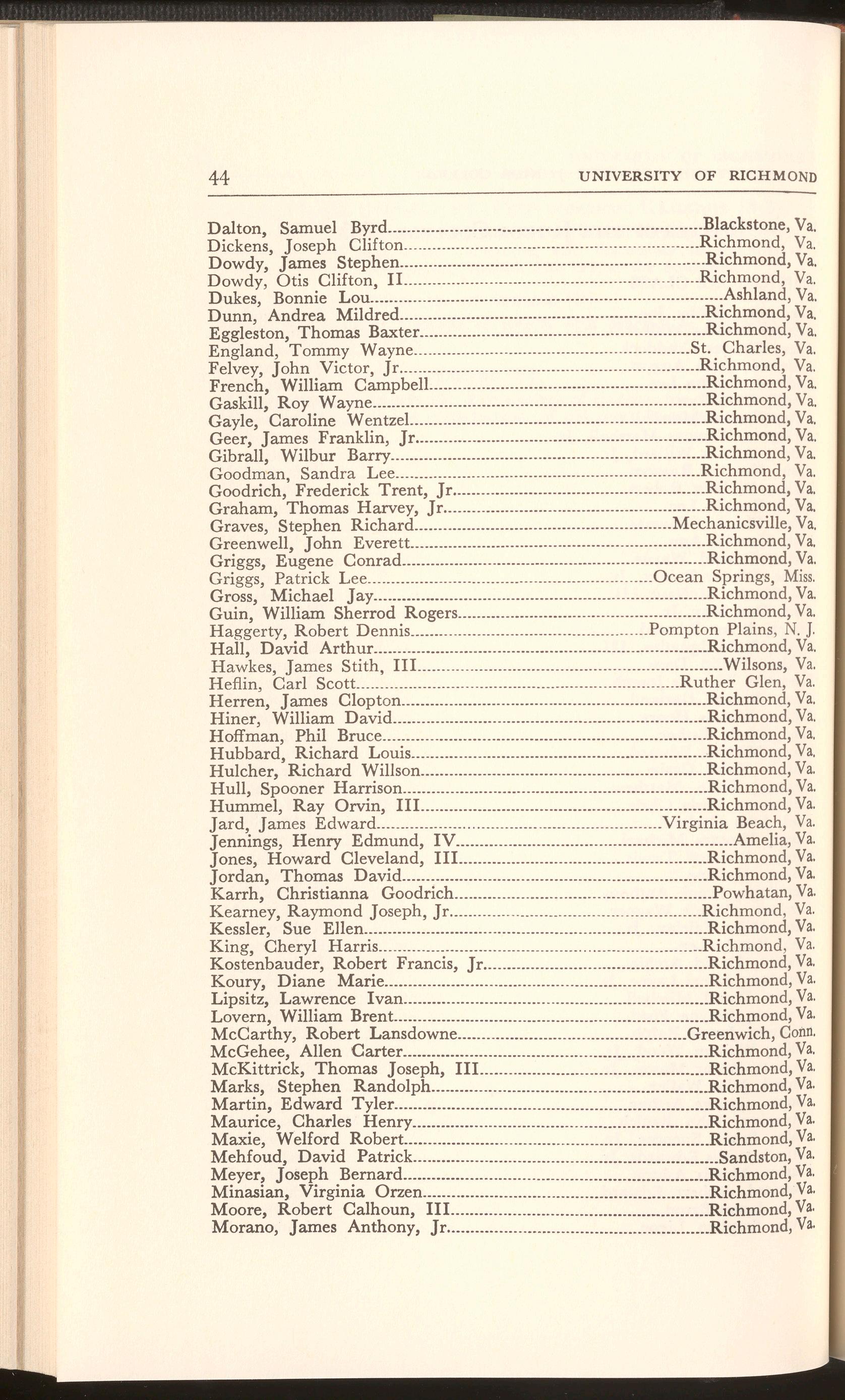 Hastings, David Carter ................................................................ Richmond, Va. Hatcher, Robert Kenneth Powhatan, Va. Hausenfluck, Robert Dale Richmond, Va, Hawkins, Linda Carol.. Richmond, Va. Hawthorne, Dean Stapleton ...Richmond, Va.