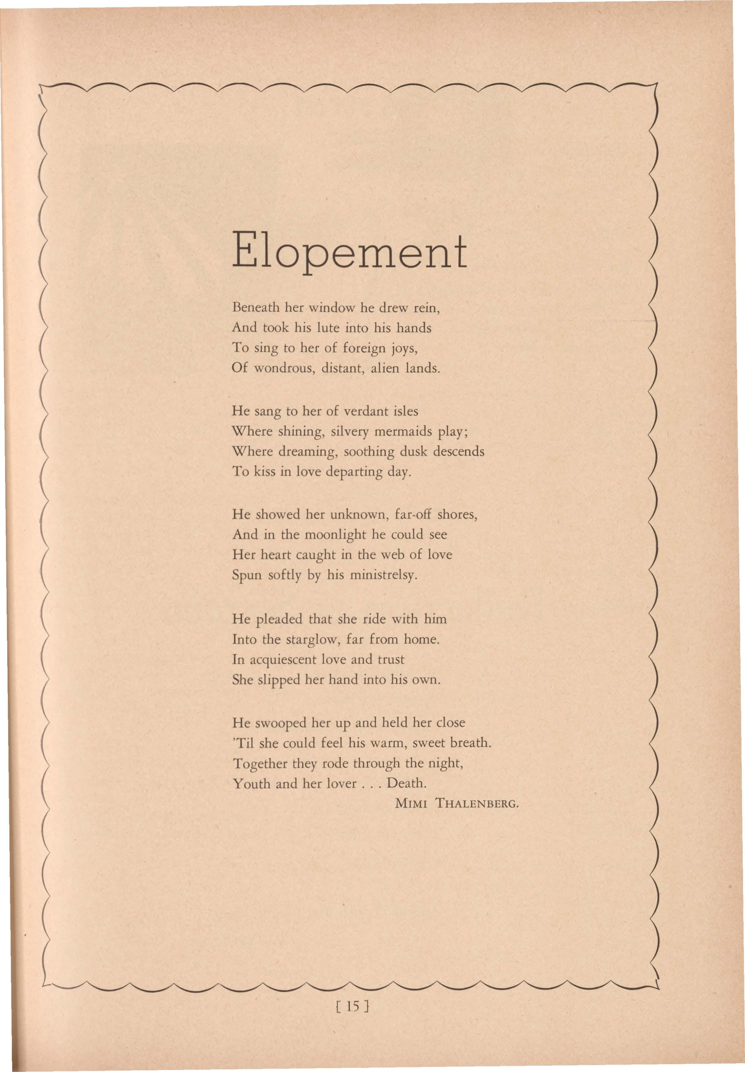 He pleaded that she ride with him Into the starglow, far from home. In acquiescent love and trust She slipped her hand into his own.