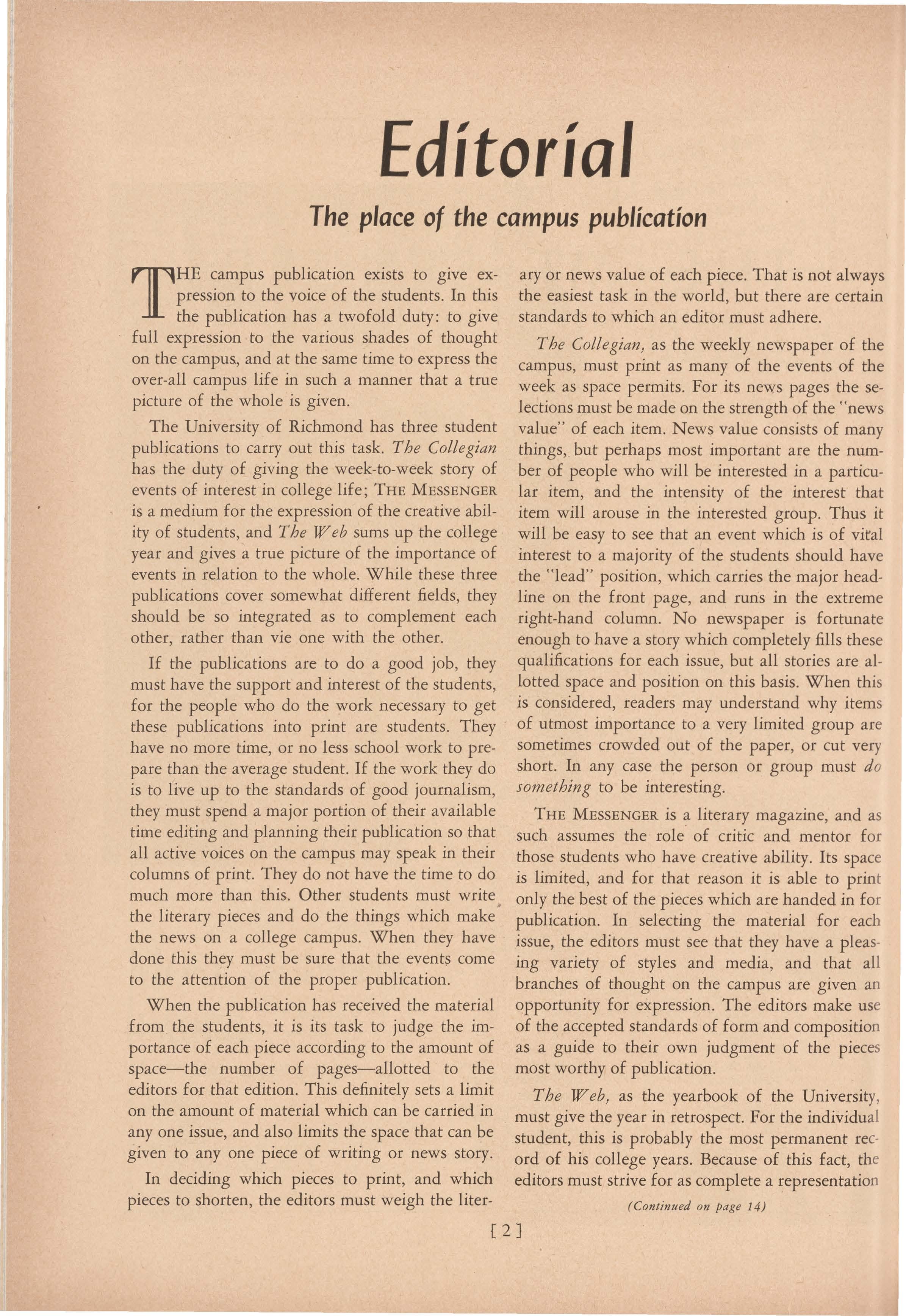 The University of Richmond has three student publications to carry out this task. The Collegian has the duty of giving the week-to-week story of events of interest in college life; THE MESSENGER is a medium for the expression of the creative ability of students, and The Web sums up the college year and gives a true picture of the importance of events in relation to the whole. While these three publications cover somewhat different fields, they should be so integrated as to complement each other, rather than vie one with the other.