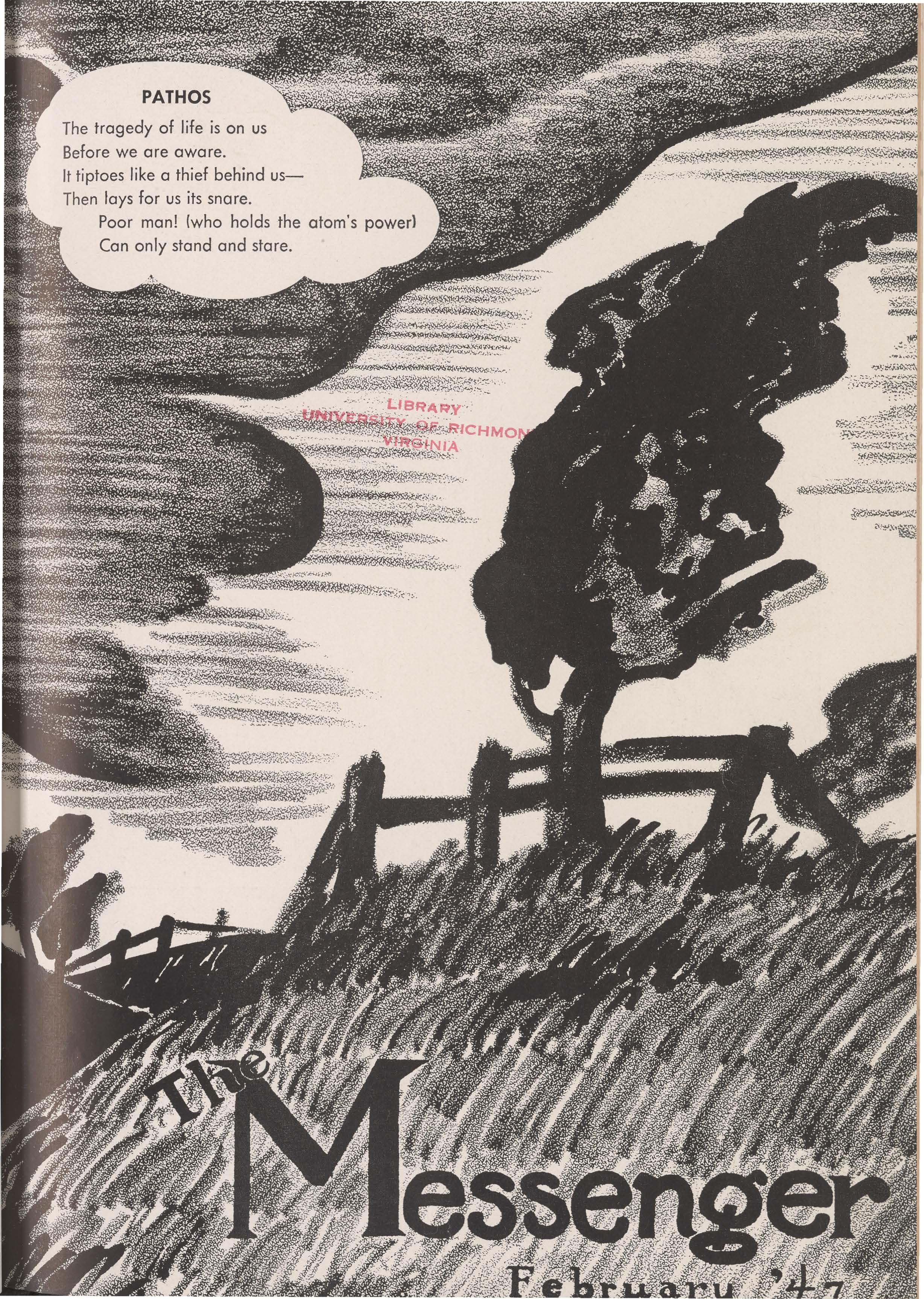 THE MESSENGERis a literary magazine, and a s such assumes the role · of critic and mentor fo r those students who have creative ability. Its spac e is limited, and for that reason it is able to prin t only the best of the pieces which are handed in fo r publication. In selecting the material for each issue, the editors must see that they have a pleasing variety of styles and media, and that all branches of thought on the campus are given a n opportunity for expression. The editors make us e of the accepted standards of form and compositio n as a guide to their own judgment of the piece s most worthy of publication.