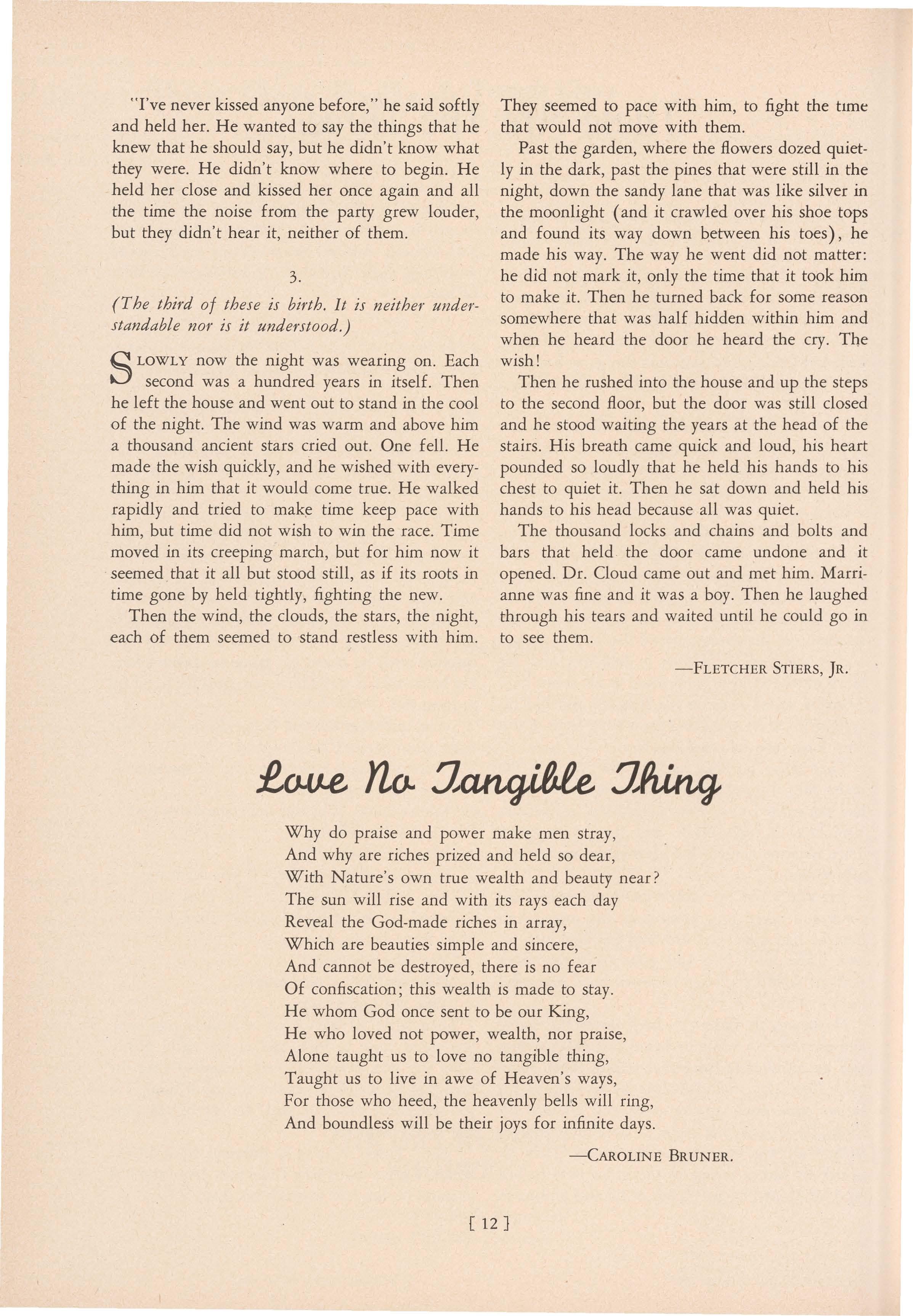 SLOWLY now the night was wearing on. Each second was a hundred years in itself. Then he left the house and went out to stand in the cool of the night. The wind was warm and above him a thousand ancient stars cried out. One fell. He made the wish quickly, and he wished with everything in him that it would come true. He walked rapidly and tried to mak~ time keep pace with him, but time did not wish to win the race. Time moved in its creeping march, but for him now it ·seemed that it all but stood still, as if its roots in time gone by held tightly, fighting the new