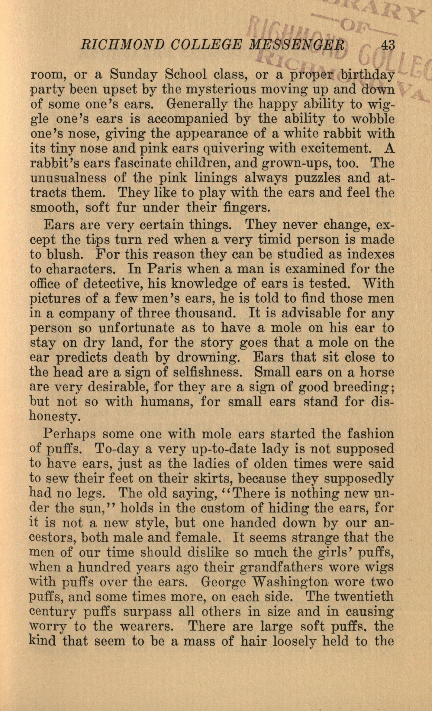 THE RICHMOND COLLEGE MESSENGER (founded 1878; named for the Southern Literary Messenger) is published on the first of each month from October to May, inclusive, by the PlIILOLO<lIAN and MU SIGMA RHO Literary Societie •, in conjunction with the students of Westhampton College, Its aim is to foster literary composition in the college, and contributions are solicited from all students, whether soetety melnbere or not. A JOINT WRITER'S MEDAL, valued flt twenty-ftve dollars, will be given by the two societies to the writer of the best article appearing in THE MESSENGER during the year. All contributions should be handed to the depaitment editors · or tho Editor-in-Chief by the fifteenth of the month preceding. Business cotn, munications and subscriptions should be directed to the BU8iness Manager and Assistant Business Manager, respectively.