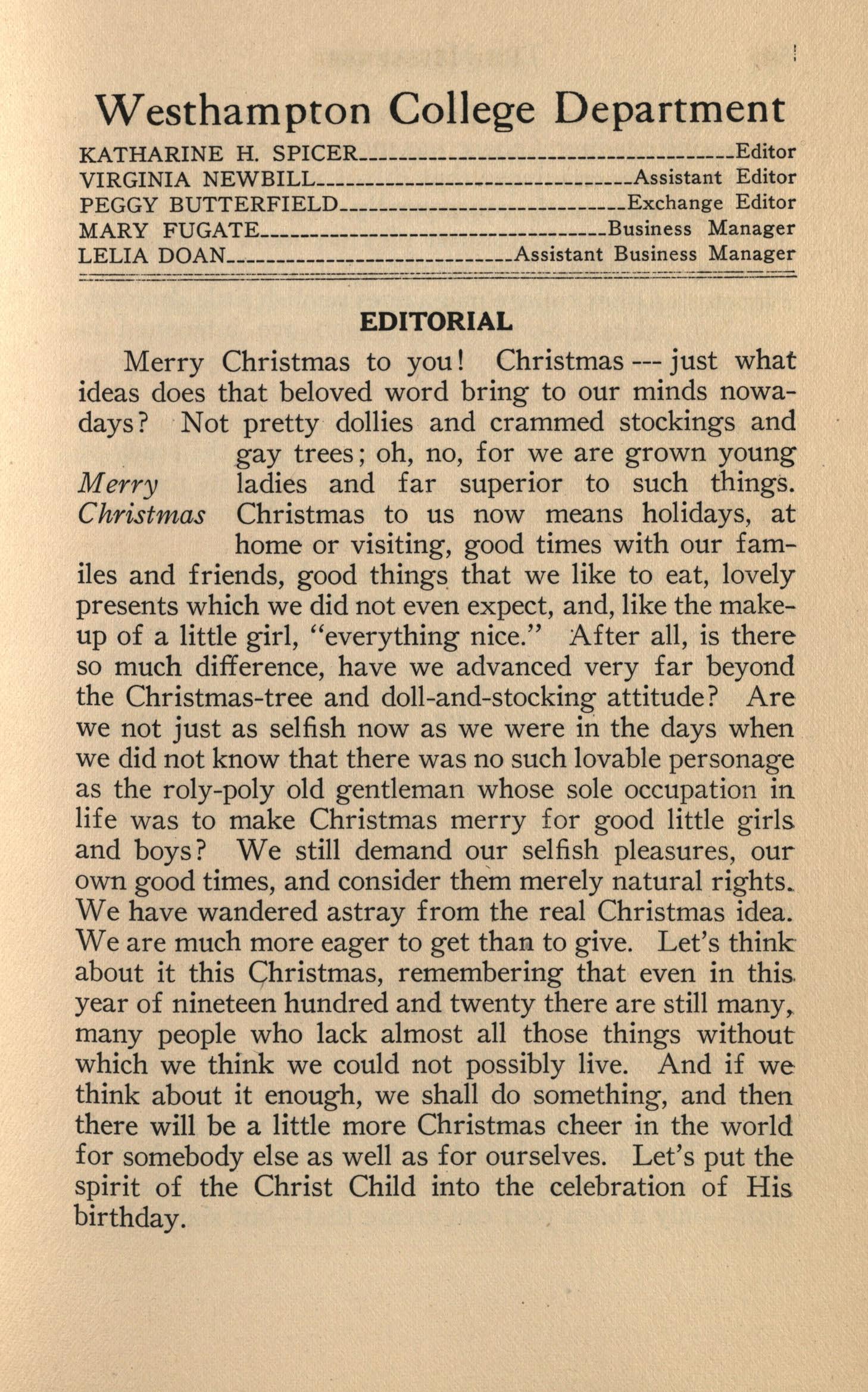 The exchange list between Westhampton and other women's colleges is, at present, rather limited, but we are hoping to enlarge this department in the near future, thus giving our college the benefit of what others are doing in literary lines. We may in this way get ideas for the improvement of our own publications. The following are brief reviews of other college monthlies. These magazines will be left on the Reading Room shelf, where anyone interested may investigate for herself.