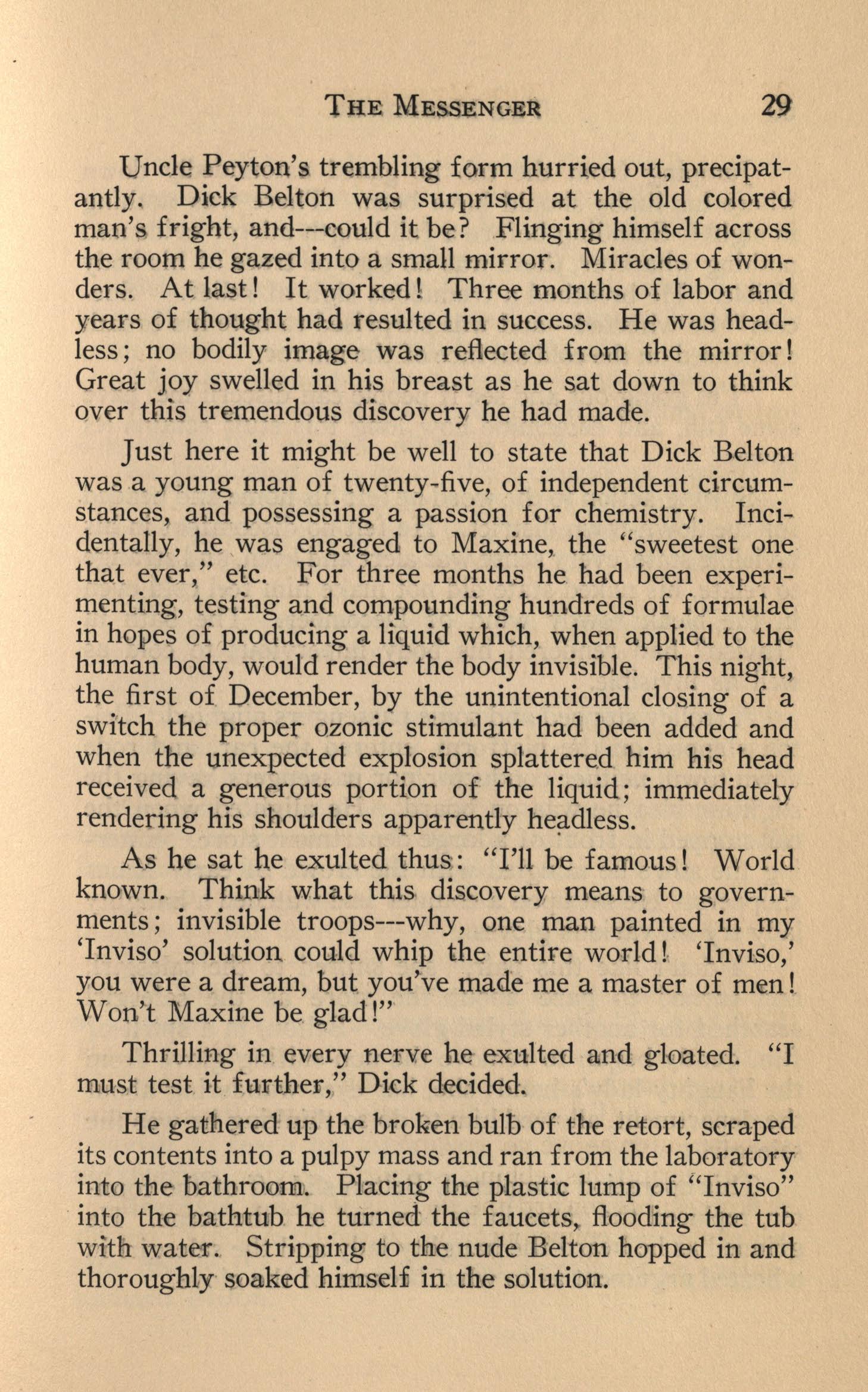 Just here it might be well to state that Dick Belton was a young man of twenty-five, of independent circumstances, and possessing a passion for chemistry. Incidentally, he was engaged to Maxine, the "sweetest one that ever," etc. For three months he had been experimenting, testing and compounding hundreds of formulae in hopes of producing a liquid which, when applied to the human body, would render the body invisible. This night, the first of December, by the unintentional closing of a switch the proper ozonic stimulant had been added and when the unexpected explosion splattered him his head received a generous portion of the liquid; immediately rendering his shoulders apparently he?-dless.