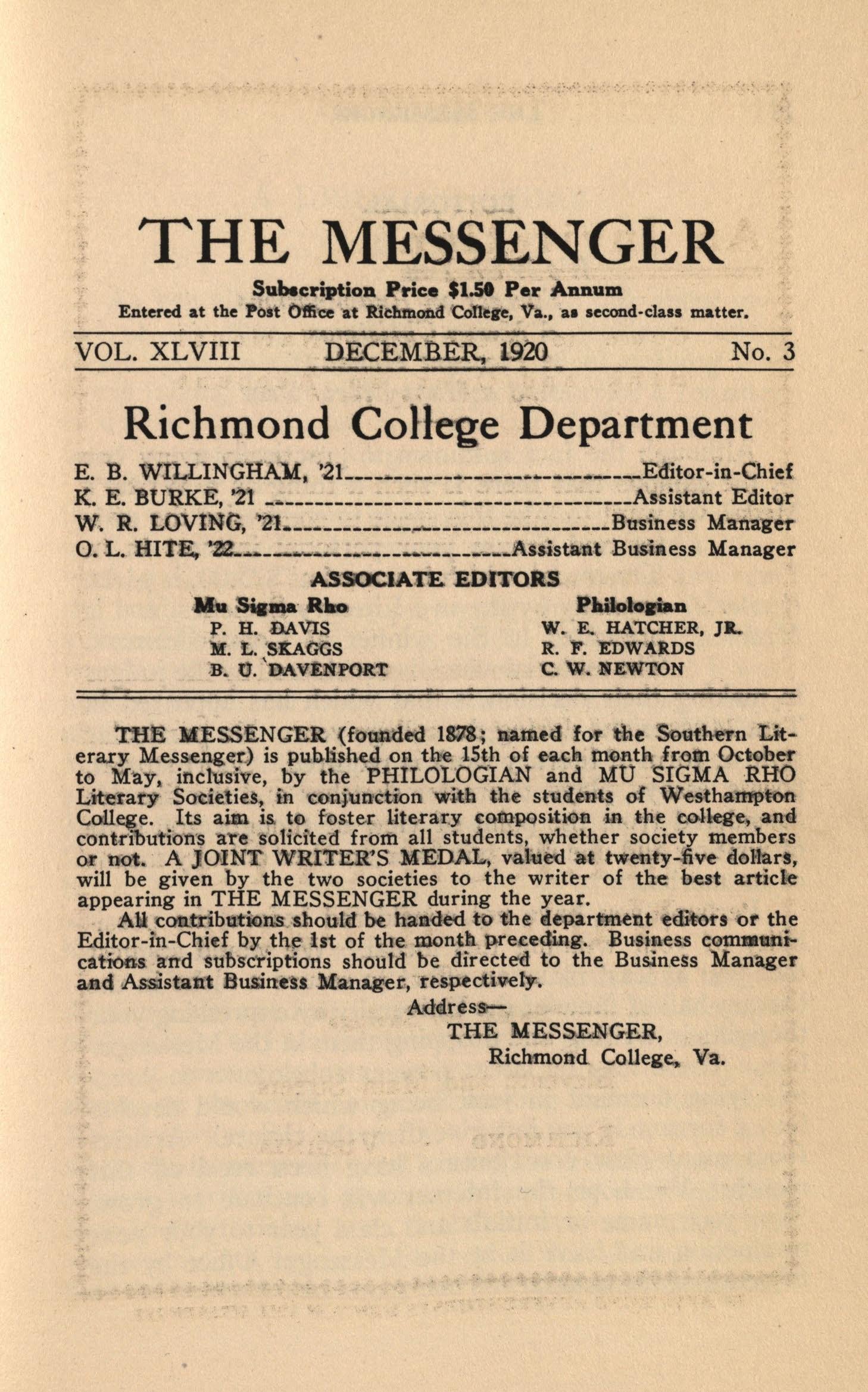 'l'Hii llESSENG'ER (fotllld~ 18'8; named lot tile Southern t.iterary Messenger..) is puhlished on the -15th of each month from October to May, inclusi<ve, by the PHILOL'OGIAN and MU SIGMA RHO Lite:tary Sotidies. fu ·conjuni;:tion wlt-h the student! of w~sthartll)ton Coll~e. Its aim is. to foster literar.y composition .in the oo.Uege, and cotltr'ibution ·s -ate ·solidtecl from all students, whether society members or oot. A JOINT WRl'TER•S YEDAL., valued 3t twenty4ive dollars, will be given by the two societies to the writer of the best article appearing in THE MESSENGER during the year . . AU. c011_ttib~tions_·should handed tb- the i!leparfment -editors 'ot the Editor-in-Chief by the, ist of the JllQnth p.rece($ing. Business communrcations and sul'>scriptions should be directed to the Business Manager and Ass'istant Bu&intlS Man~ei:;, respectively.