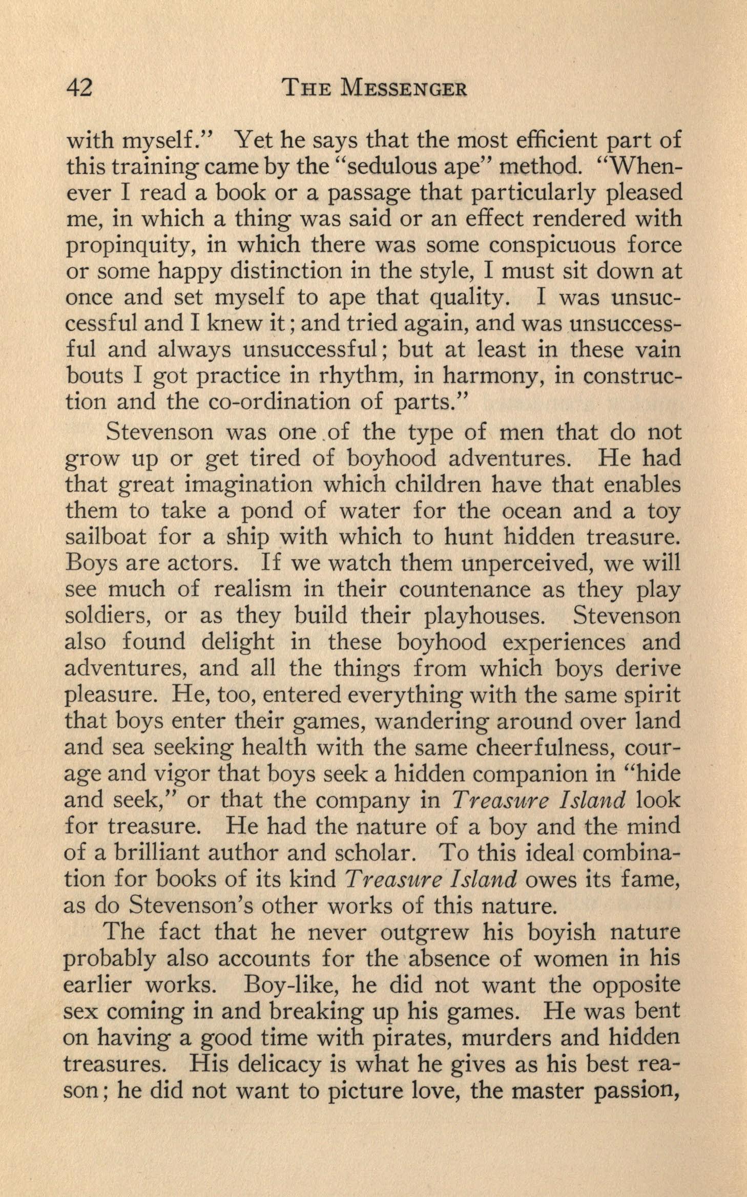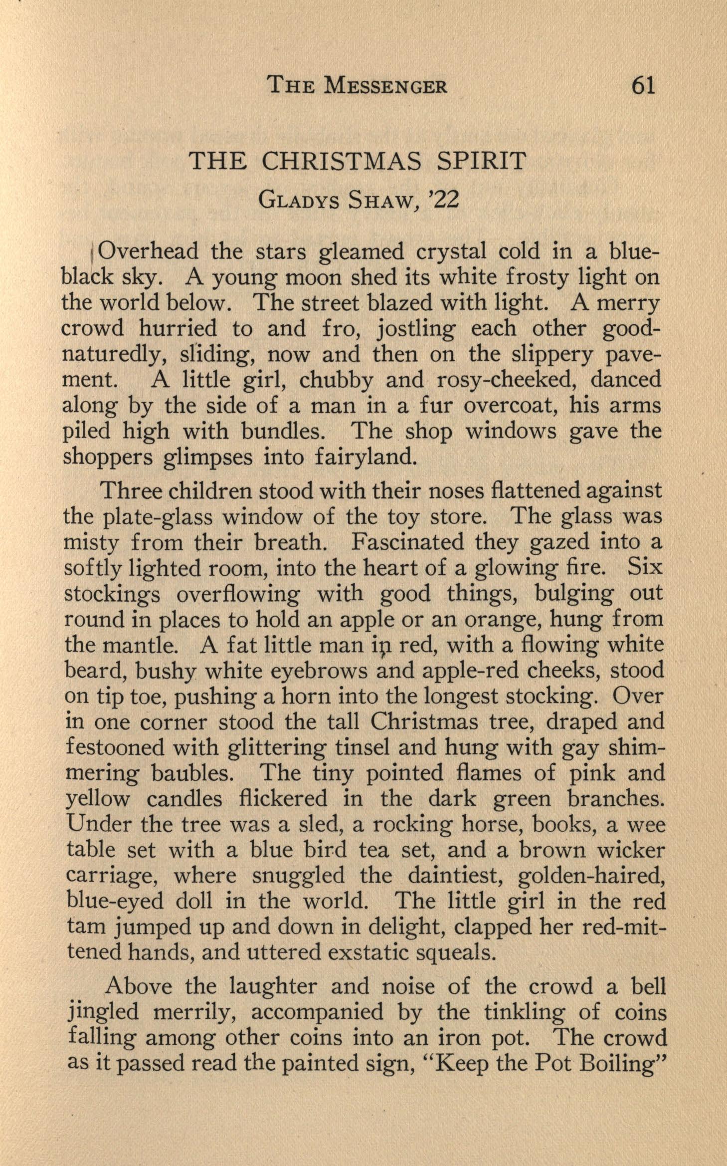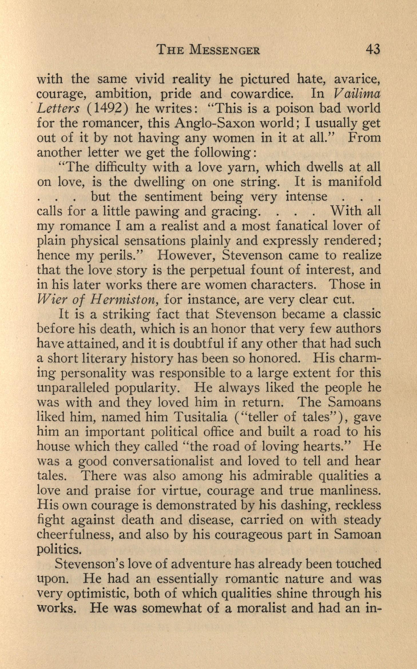 Perhaps you have not considered before the possibility of your vyinning this medal. We would suggest that ·you at least make an effort to secure a niche in the literary hall of fame of the University by expressing your thoughts in writing and dropping them in the Messenger box. There may be latent powers unbeknown to yourself lying dormant in your being which would develop into a fortune if you but give them the chance. Articles from many new contributors have been received this month. We hope the interest will continue to grow. Sign your name or initials and class year to your next production and leave it at the Messenger Office by the fifteenth of the month.
