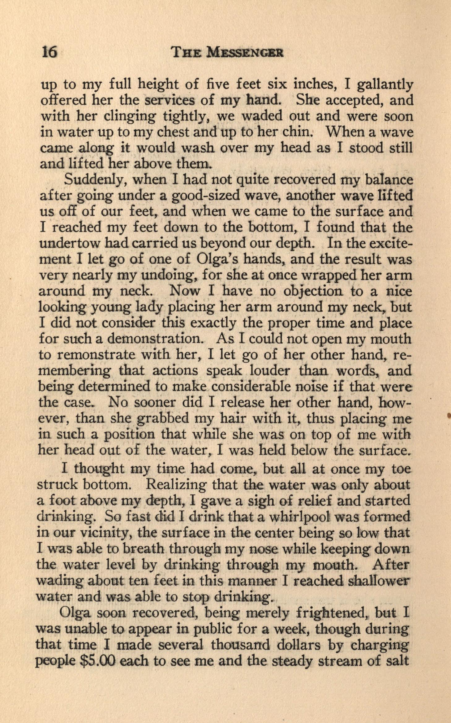 up to my full height of five feet six inches, I gallantly offered her the services of my hand. She accepted, and with her clinging tightly, we waded <;>utand were soon in water up to my chest and qp to her chin. When a wave came along it would wash over my head as I stood still and lifted her above them. Suddenly, when I had not quite recovered niy balance after going under a good-sized wave, another wave lifted us off of our feet~ and when we came to the surface and I reached my feet down to the bottom, I found that the undertow had carried us beyond our depth. In the excitement I let go of one of Olga's hands, and the result was very nearly my undoing, for she at once wrapped her arm around tny neck. Now I have no objection to a nice looking young lady pl.acing her arm around my neck,. but I did not consider this exactly the proper time and place for such a demonstration. As I could not open my mouth to remonstrate with her, I let go of her other hand, remembering that actions s,peak louder than words,, and being determined to make considerable n01se if that were the case.. Na sooner did I release her other hand, however, than she grabbed my hair with it, thus placing me in such a position that while she was on top of me with her head out of the water, I was held below the surface. I thought my time had come , but all at once my toe struck bottom. Realizing that the water was only about a foot above my depth , I gave a sigh of relief and started drinking. So fast did I drink that a whirl poohwas fortned in our vicinity, the surface in the center being so low that I was able to breath through my nose while keeping down the water level hy drinking through my mouth. After wading al>oliltten feet in this manner I reached shallower water and was able to stop drinking .