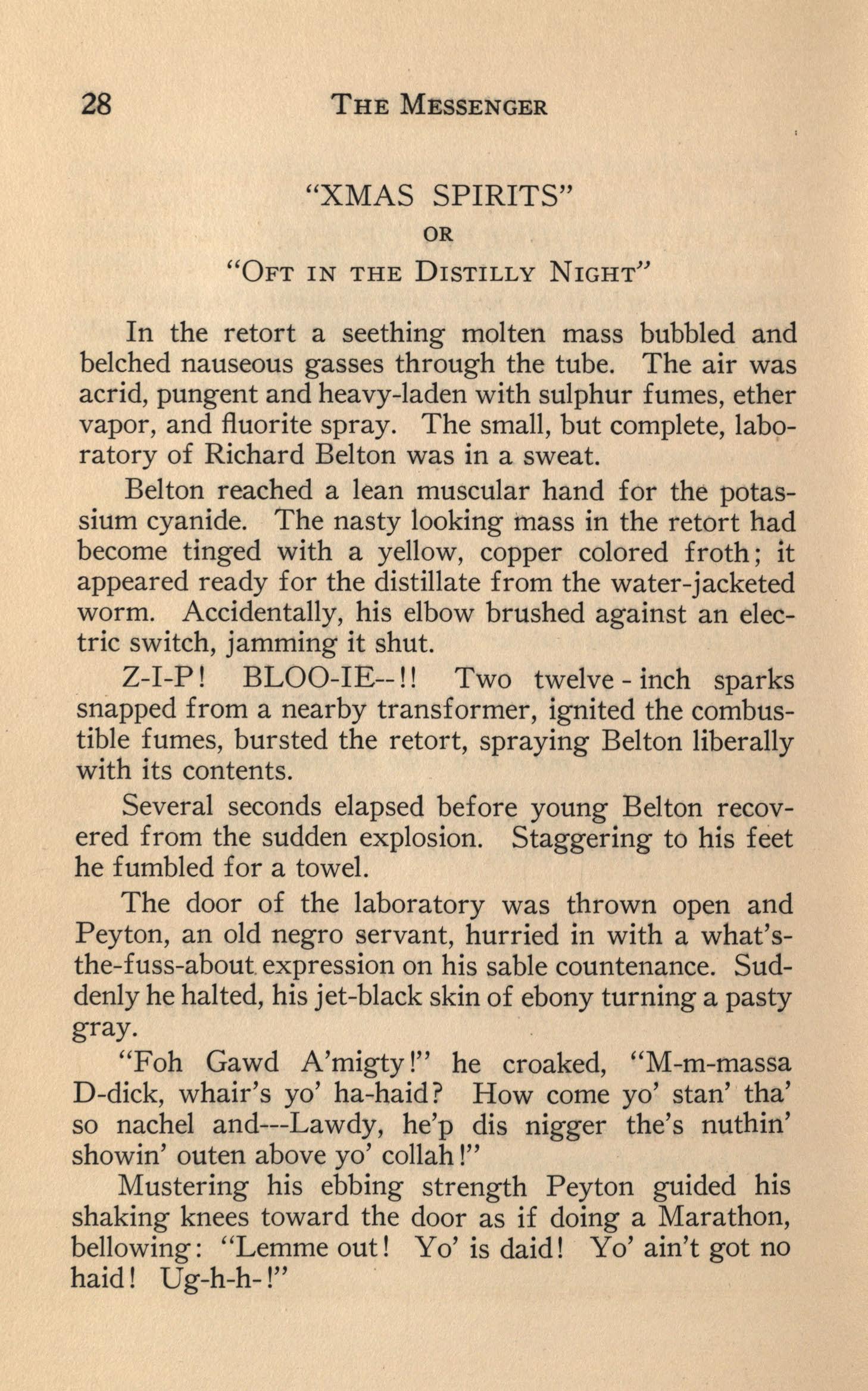 In the retort a seething molten mass bubbled and belched nauseous gasses through the tube. The air was acrid , pungent and heavy-laden with sulphur fumes, ether vapor, and fluorite spray. The small, but complete, laboratory of Richard Belton was in a sweat.