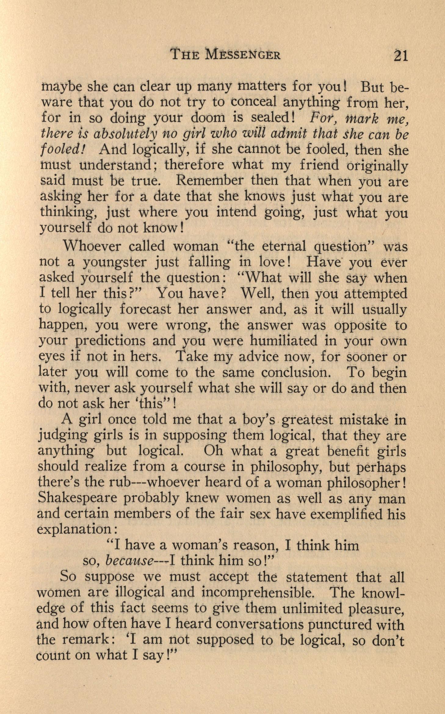 A girl once told me that a boy's greatest mistake in judging girls is in supposing them logical, that they are anything but logical. Oh what a great benefit gir1s should realize from a course in philosophy, but perhaps there's the rub---whoever heard of a woman philosopher! Shakespeare probably knew women as well as any man and certain members of the fair sex have exemplified his explanation :