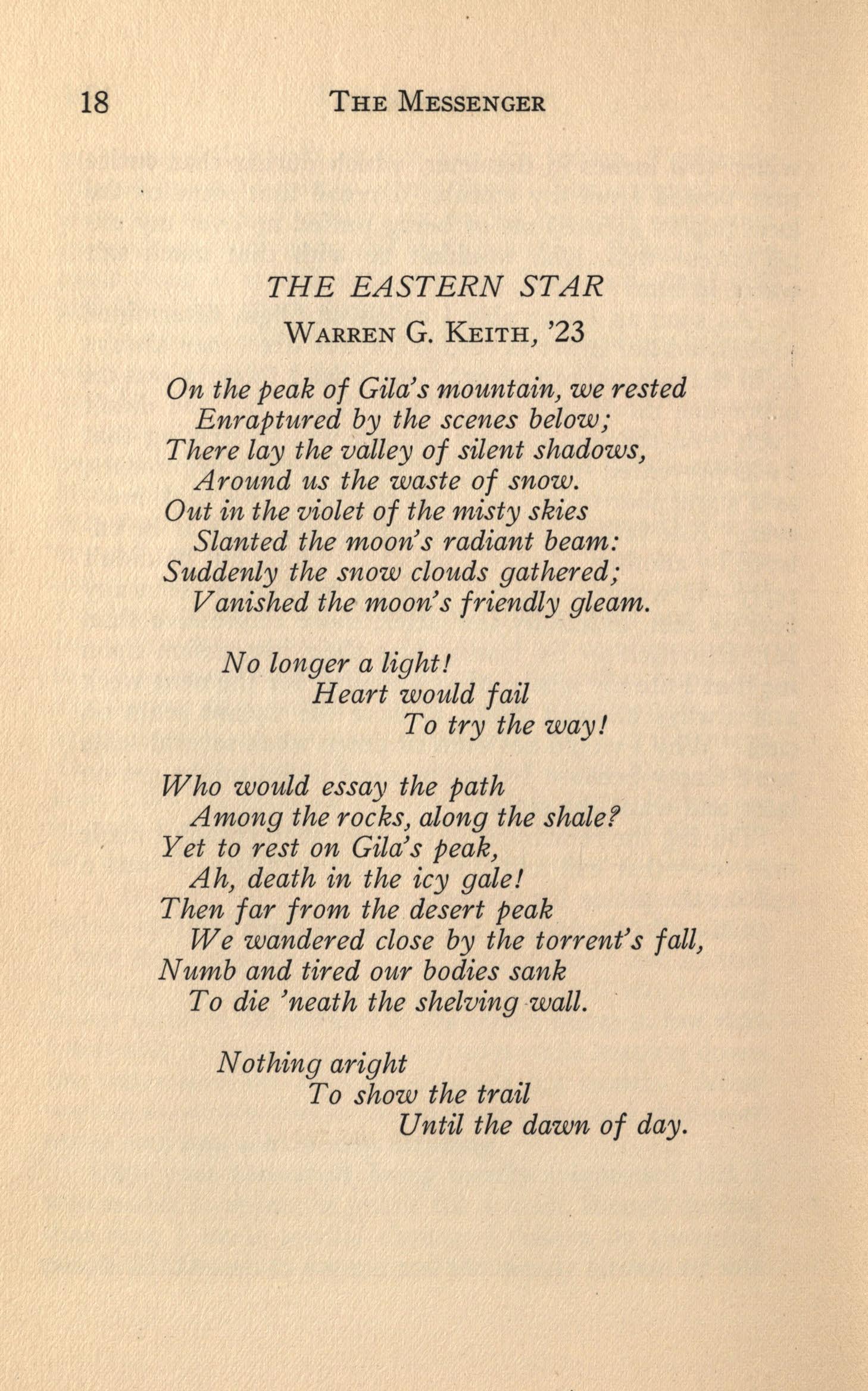 The STAR of the East in the heaven of blue. Far from Gila have we wandered, Yet when lost in life's gale We can turn to that shining light: . The Eastern ST AR lights up the trail.
