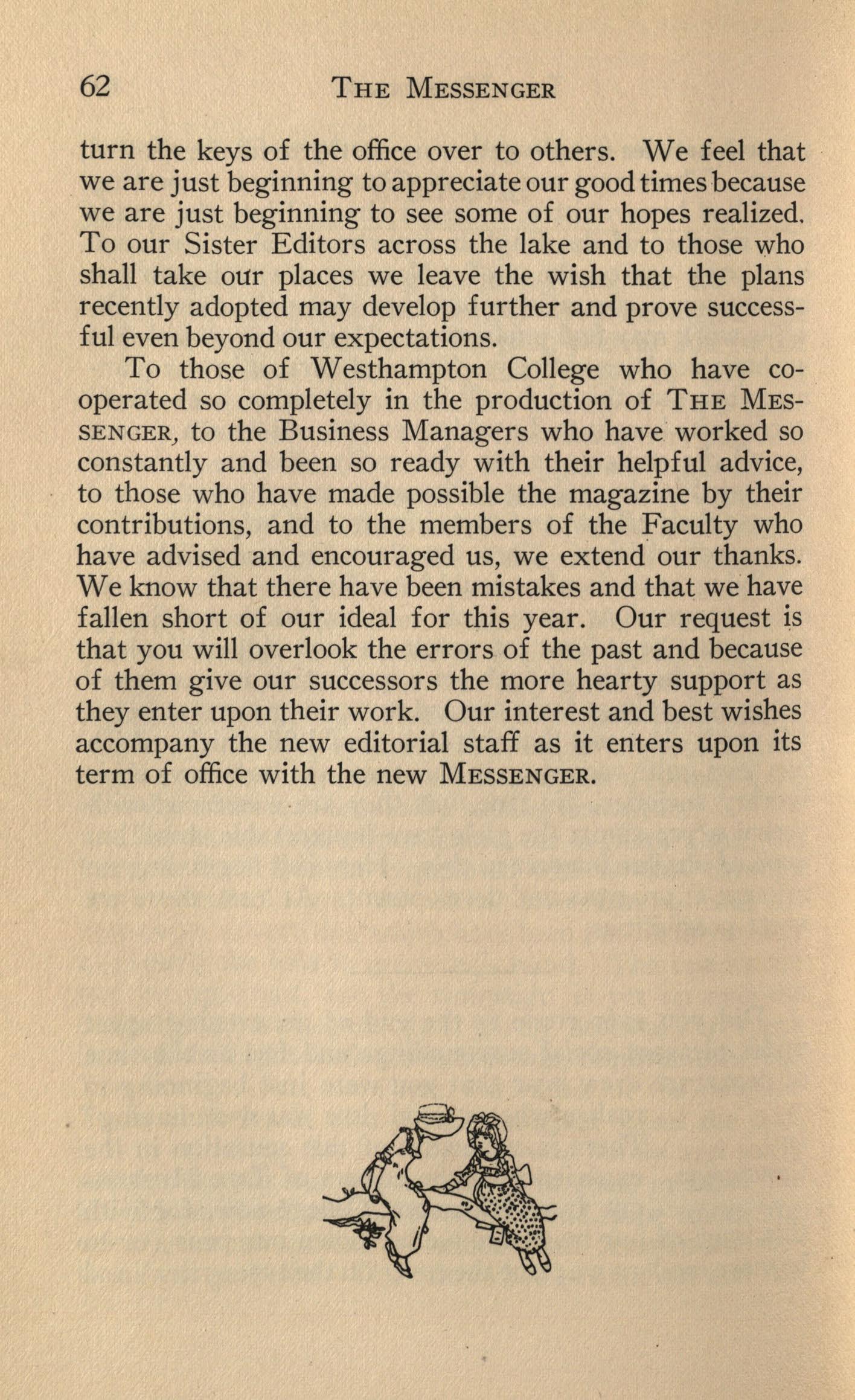 To those of Westhampton College who have cooperated so completely in the production of THE MESSENGER,to the Business Managers who have worked so constantly and been so ready with their helpful advice, to those who have made possible the magazine by their contributions, and to the members of the Faculty who have advised and encouraged us, we extend . our thanks. We know that there have been mistakes and that we have fallen short of our ideal for this year. Our request is that you will overlook the errors of the past and because of them give our successors the more hearty support as they enter upon their work. Our interest and best wishes accompany the new editorial staff as it enters upon its term of office with the new MESSENGER.