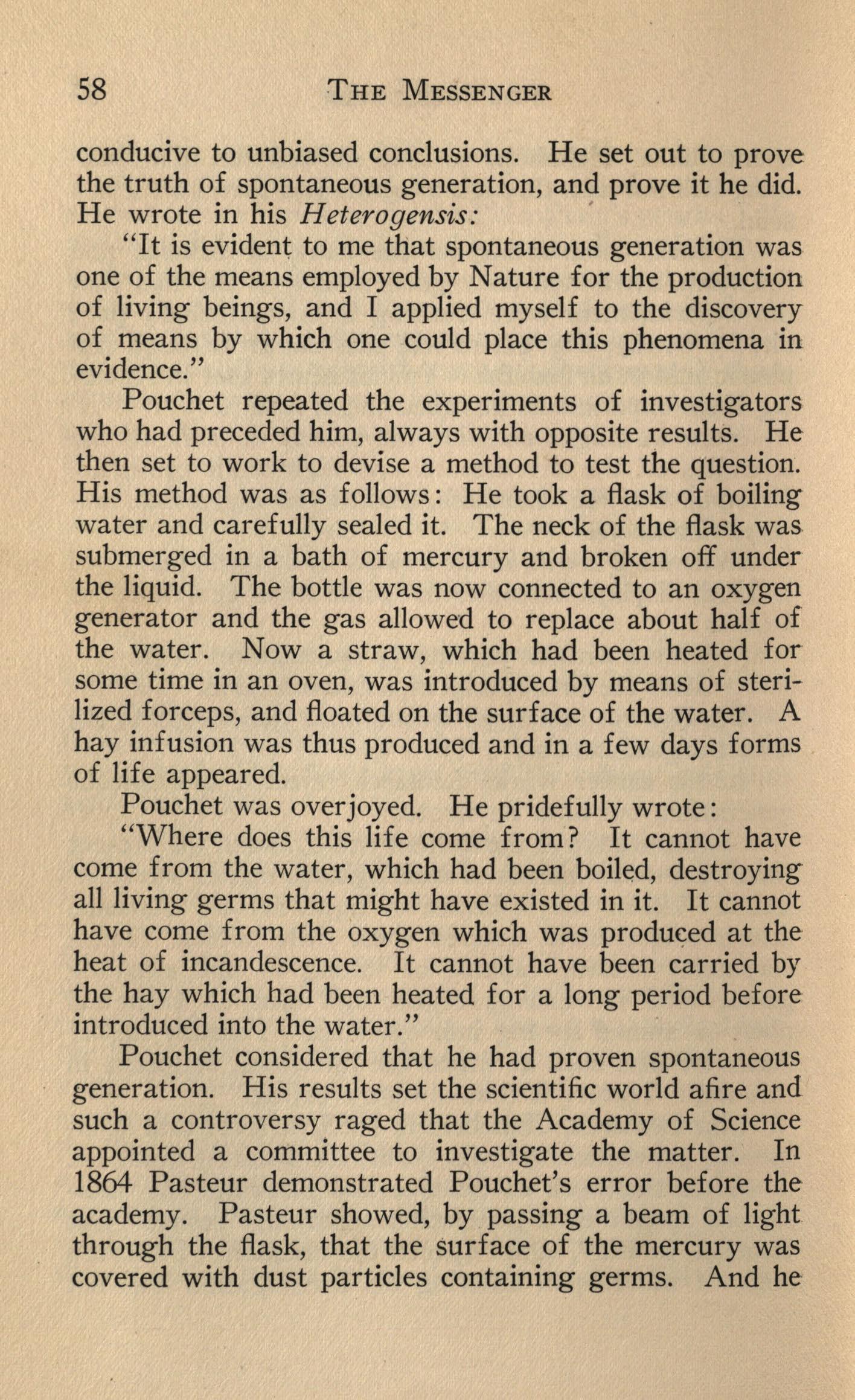 After the work of Schulze and Schwann the question of spontaneous generation apparently rested. But Pouohet, in 1859, again opened the question. Pouchet's state of mind upon entering his investigation was not