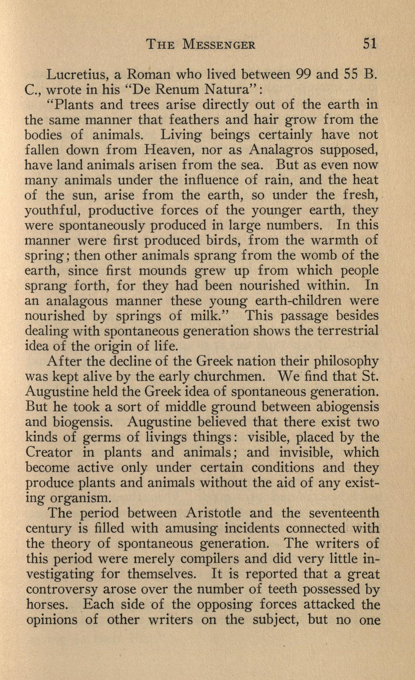 After the decline of the Greek nation their philosophy was kept alive by the early churchmen. We find that St. Augustine held the Greek idea of spontaneous generation. But he took a sort of middle ground between abiogensis and biogensis. Augustine believed that there exist two kinds of germs of livings things : visible, placed by the Creator in plants and animals; and invisible, which become active only under certain conditions and they produce p~ants and animals without the aid of any existmg orgamsm.