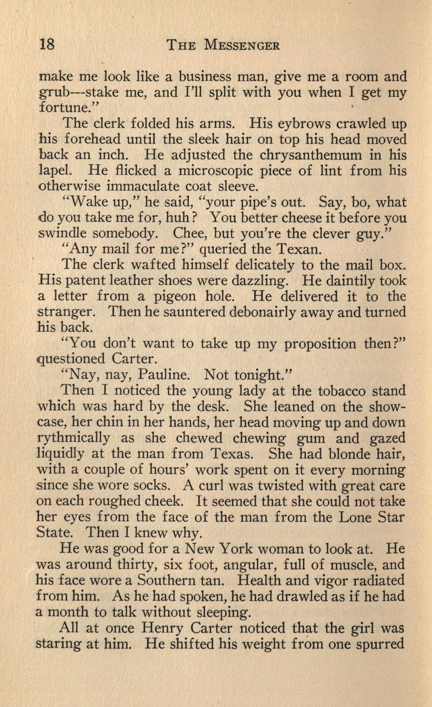 Then I noticed the young lady at the tobacco stand which was hard by the desk. She leaned on the showcase, her chin in her hands, her head moving up and down rythmically as she chewed chewing gum and gazed liquidly at the man from Texas. She had blonde hair, with a couple of hours' work spent on it every morning since she wore socks. A curl was twisted with great care on each roughed cheek. It seemed that she could not take her eyes from the face of the man from the Lone Star State. Then I knew why.
