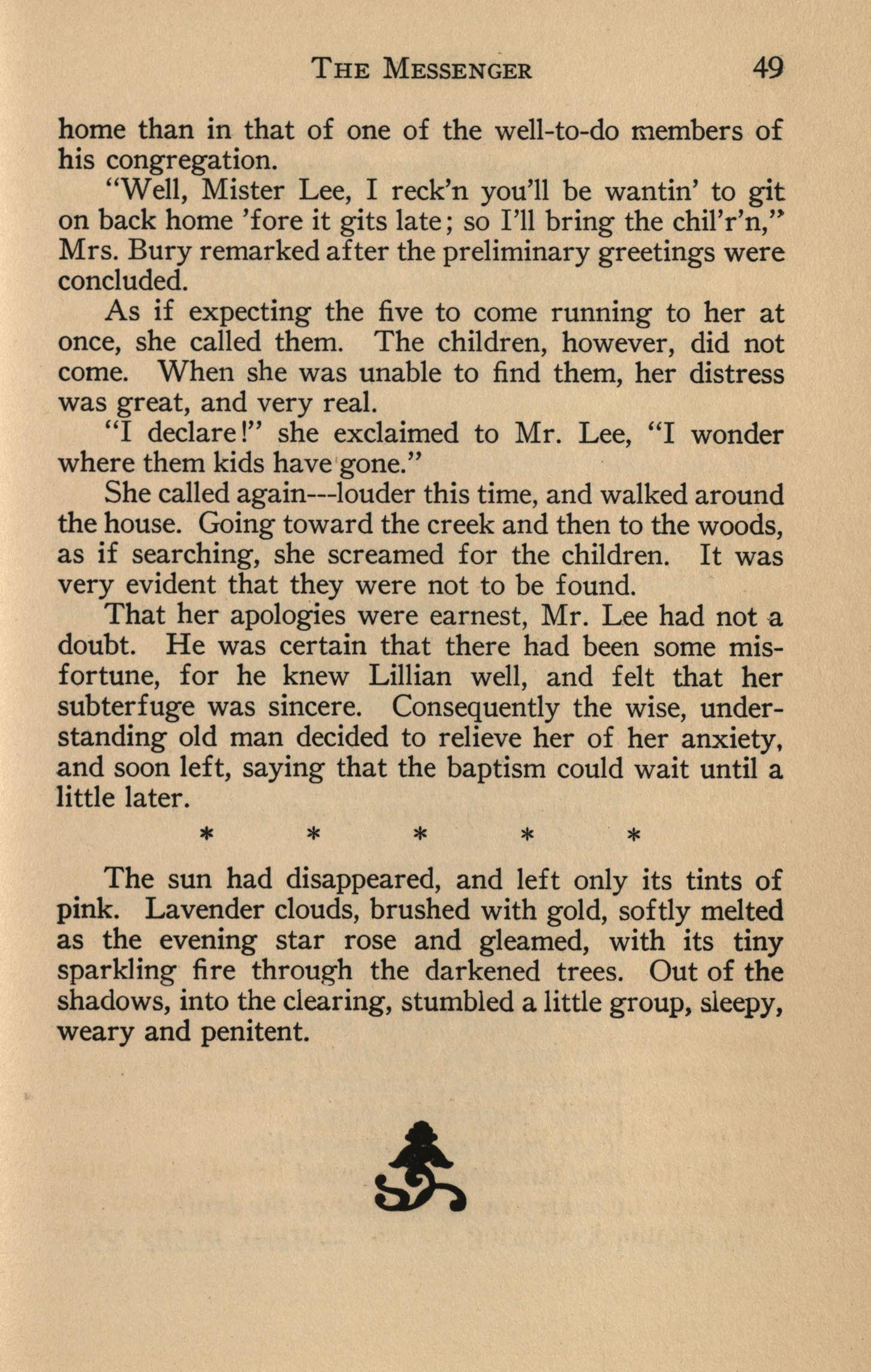 "Well, Mister Lee, I reck'n you'll be wan tin' to git on back home 'fore it gits late; so I'll bring the chil'r'n," Mrs. Bury remarked after the preliminary greetings were concluded.
