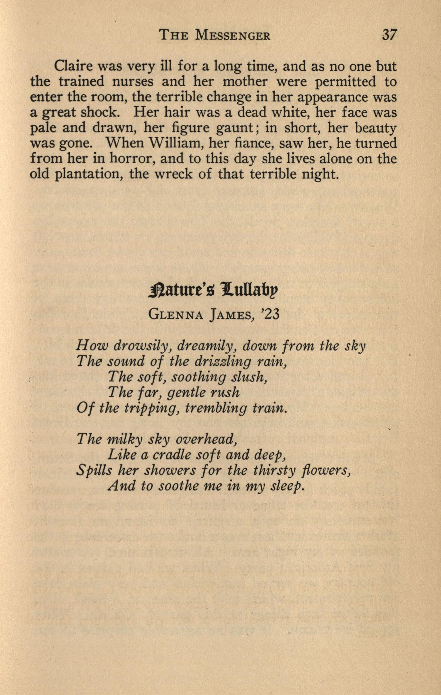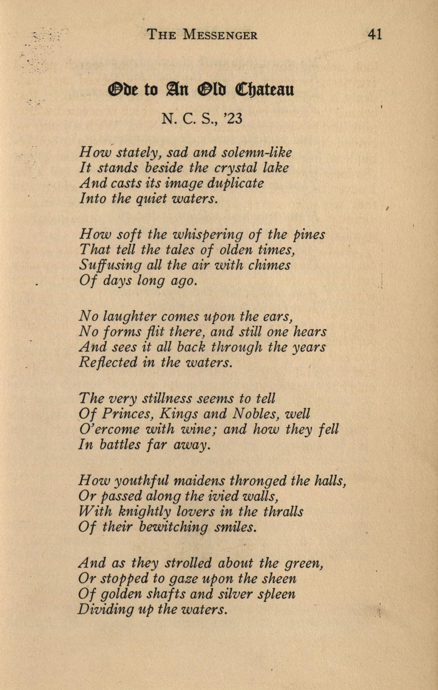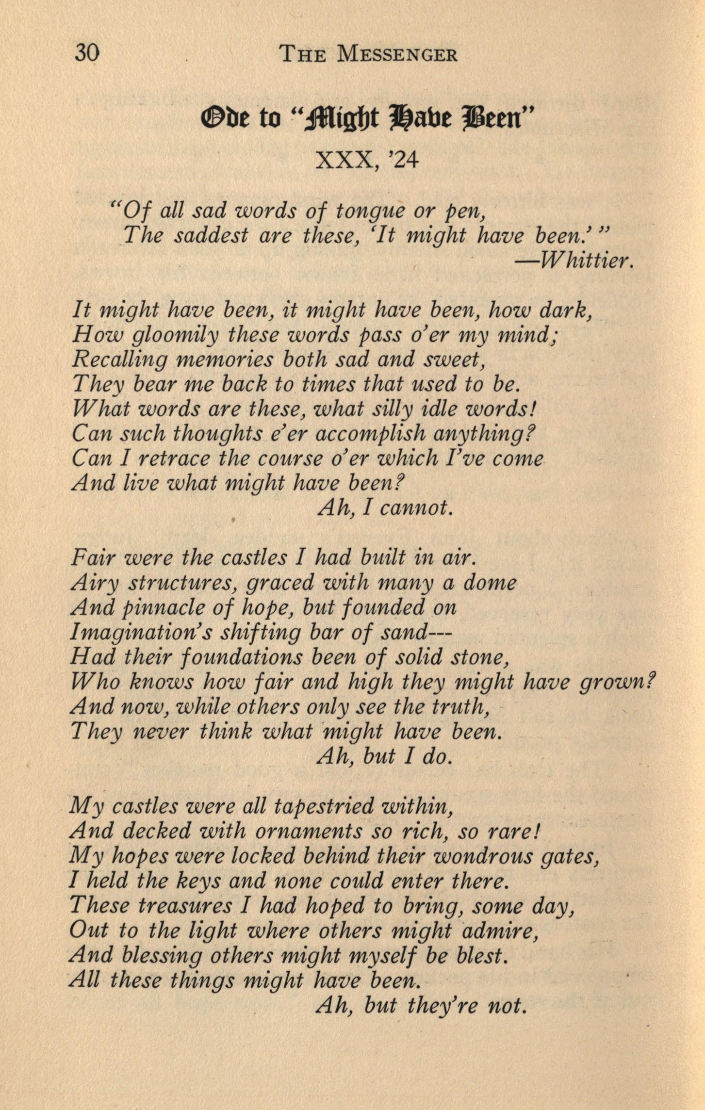 Moreover, as we turn over the keys of office to our successors, as we wish them well and assure them of what great things we expect of them, we feel that these are not mere hackneyed terms and stereotyped phrases, but words full of meaning> You, the new staff, have an advantage in these new plans, but recently put into effect, and which, unless all signs fail, should be of much benefit to THE MESSENGEB..It -se.emsthat under these con. ditions, if ·other circumstances are no more unfavorable to you than they were to us, TH.E M~SENGER of the months to come should be an interesting magazine in ·which students, faculty, a1umni and even outsiders will find both pleasure and profit.