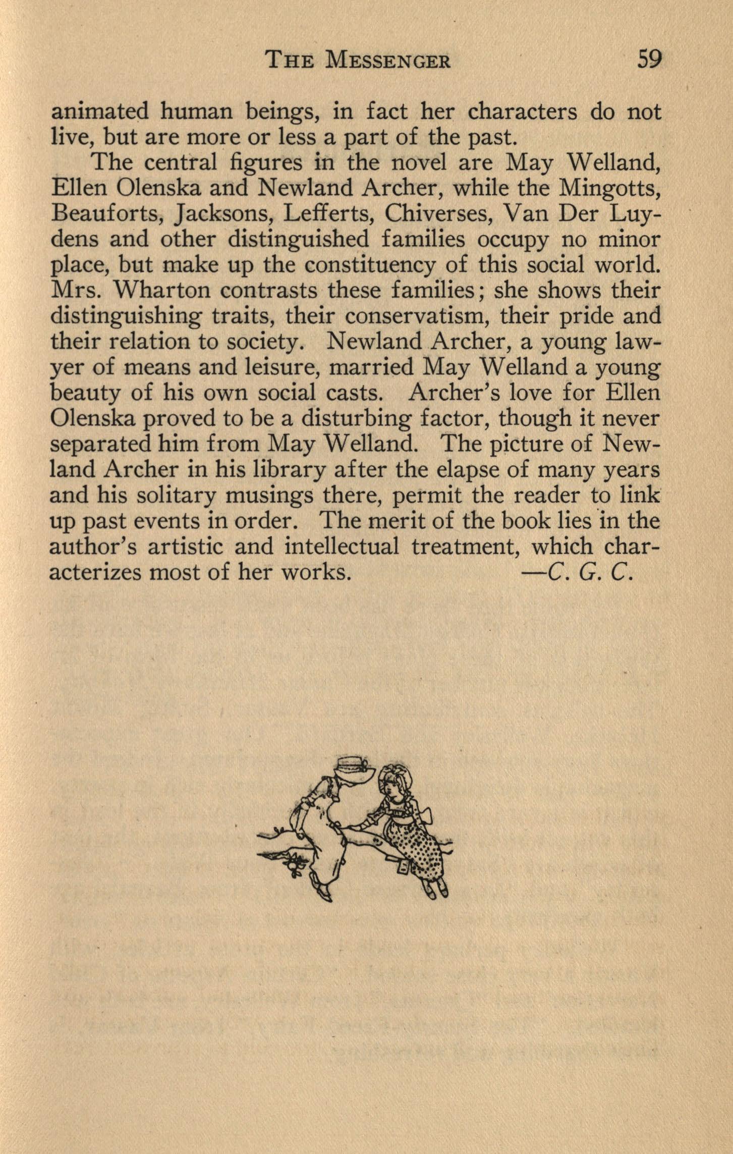 The central figures in the novel are May Welland, Ellen Olenska and Newland Archer, while the Mingotts, Beauforts, Jacksons, Lefferts, Chiverses, Van Der Luydens arid other distinguished families occupy no minor place, but make up the constituency of this social world. Mrs. Wharton contrasts these families; she shows their distinguishing traits, their conservatism, their pride and their relation to society. Newland Archer, a young lawyer of means and leisure, married May Welland a young beauty of his own social casts. Archer's love for Ellen Olenska proved to be a disturbing factor, though it never separated him from May Welland. The pjcture of Newland Archer in his library after the elapse of many years and his solitary musings there, permit the reader to link up past events in order. The merit of the book lies in the author's artistic and intellectual treatment, which characterizes most of her works. -C. G. C.