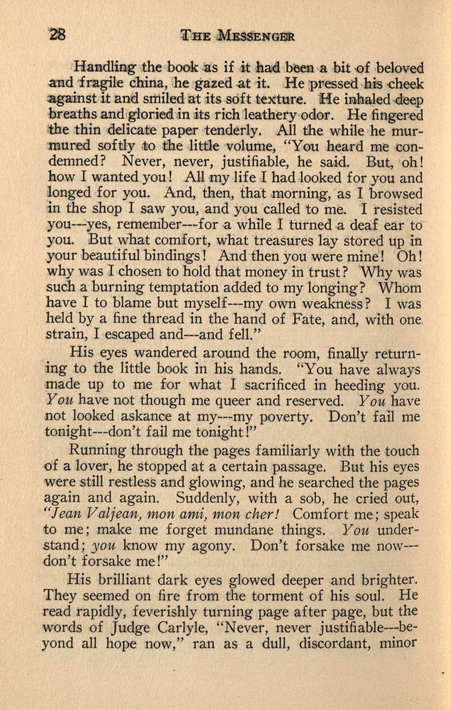 Running through the pages familiarly with the touch of a lover, he ·stopped at a certain passage. But his eyes were st.ill restless and glowing, and he searched the pages again and again. Suddenly, with a sob, he cried out, "Jean Valjean, mon ami, mon cher I Comfort me; speak to me; make me forget mundane things. You understand; you know my agony. Don't forsake me now--don't forsake me!"