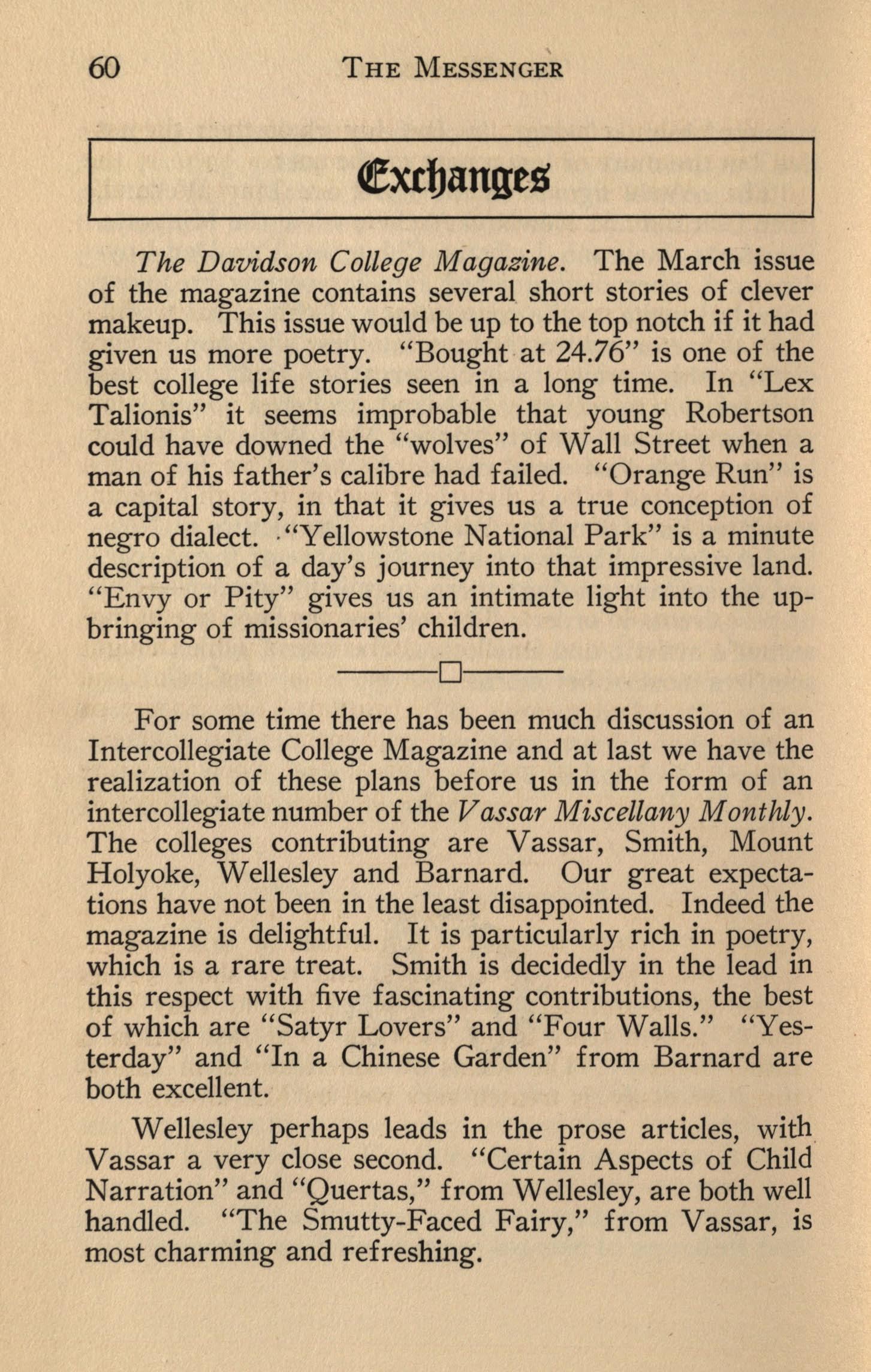 For some time there has been much discussion of an Intercollegiate College Magazine and at last we have the realization of these plans before us in the form of an intercollegiate number of the Vassar Miscellany Monthly. The colleges contributing are Vassar, Smith, Mount Holyoke, Wellesley and Barnard. Our great expectations have not been in the least disappointed. Indeed the magazine is delightful. It is particularly rich in poetry, which is a rare treat. Smith is decidedly in the lead in this respect with five fascinating contributions, the best of which are "Satyr Lovers" and "Four Walls." "Yesterday" and "In a Chinese Garden" from Barnard are both excellent.