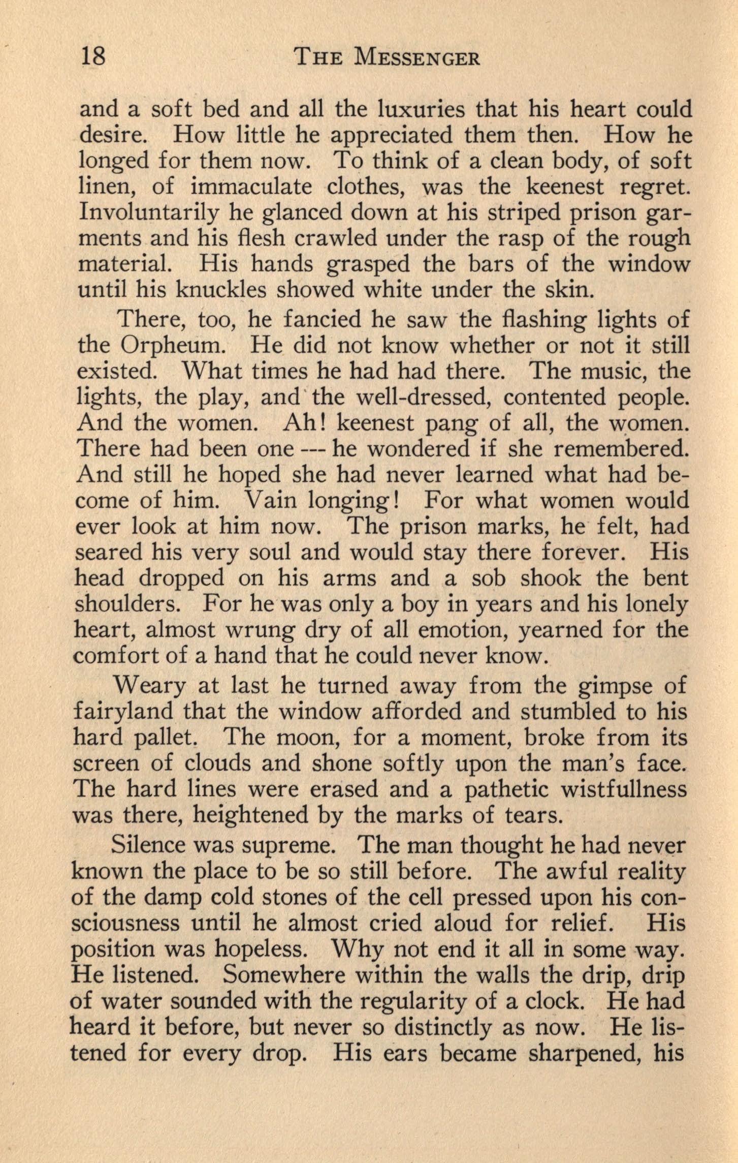 There, too, he fancied he saw the flashing lights of the Orpheum. He did not know whether or not it still existed. What times he had had there. The music, the lights, the play, and ·the well-dressed, contented people. And the women. Ah! keenest pang of all, the ~omen. There had been one --- he wondered if she remembered. And still he hoped she had never learned what had become of him. Vain longing! For what women would ever look at him now. The prison marks, he felt, had seared his very soul and would stay there forever. His head dropped on his arms and a sob shook the bent shoulders. For he was only a boy in years and his lonely heart, almost wrung dry of all emotion, yearned for the comfort of a hand that he could never know.