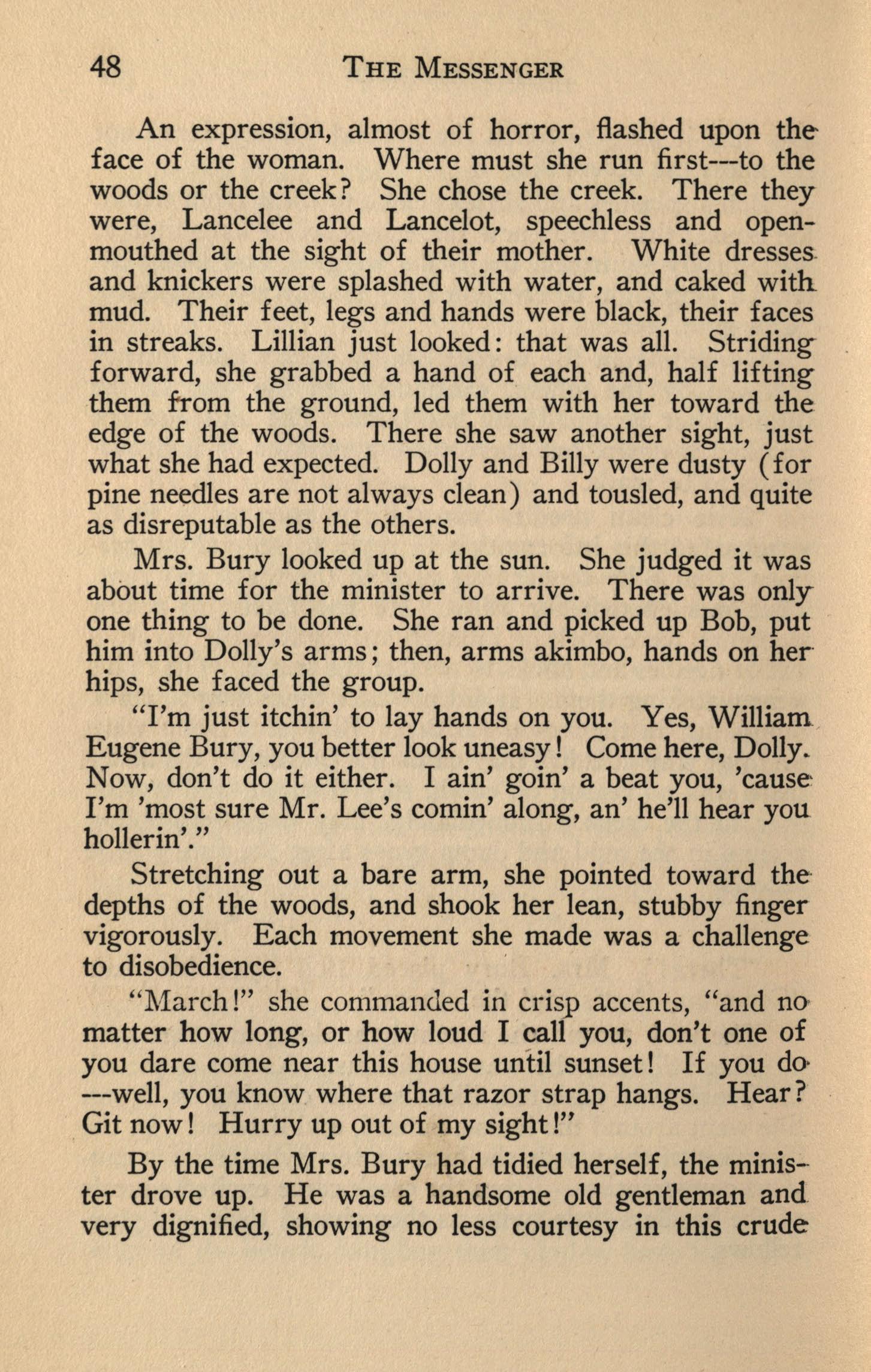"I'm just itchin' to lay hands on you. Yes, William , Eugene Bury, you better look uneasy! Come here, Dolly. Now, don't do it either. I ain' goin' a beat you, 'cause : I'm 'most sure Mr. Lee's comin' along, an' he'll hear you hollerin'."