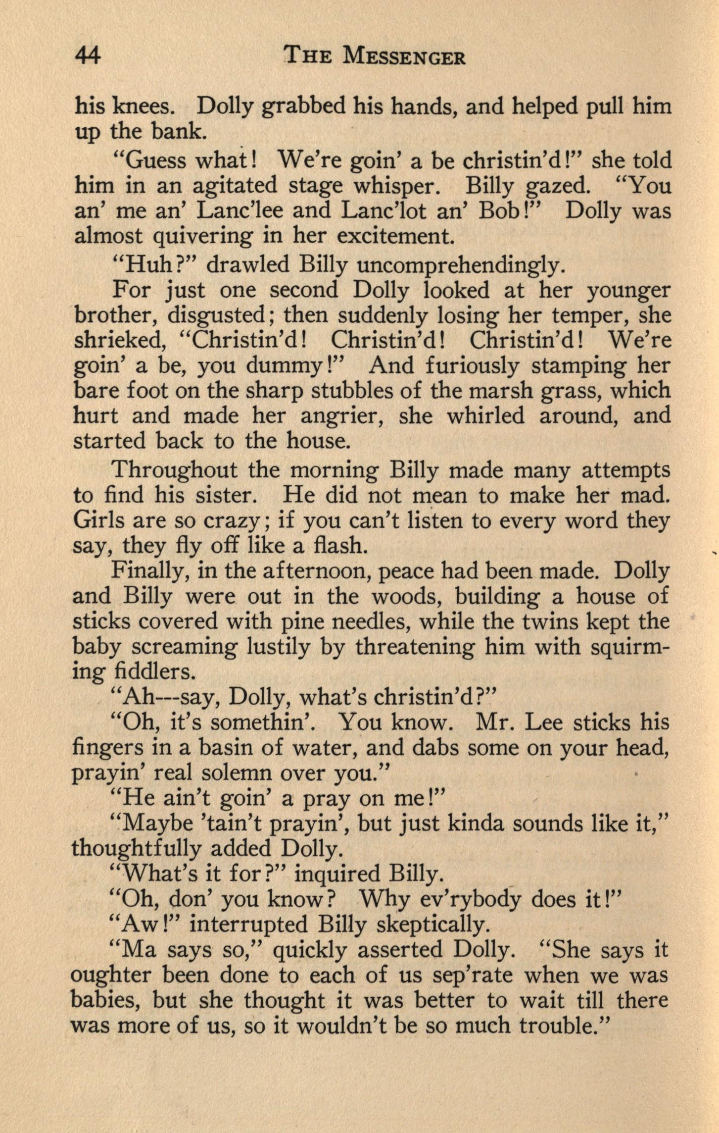 An expression, almost of horror, flashed upon the face of the woman. Where must she run first---to the woods or the creek? She chose the creek. There they were, Lancelee and Lancelot, speechless and openmouthed at the sight of their mother. White dresses . and knickers were splashed with water, and caked with mud. Their feet, legs and hands were black, their faces in streaks. Lillian just looked: that was all. Striding forward, she grabbed a hand of each and, half lifting them from the ground, led them with her toward the . edge of the woods. There she saw another sight, just what she had expected. Dolly and Billy were dusty ( for pine needles are not always clean) and tousled, and quite as disreputable as the others.