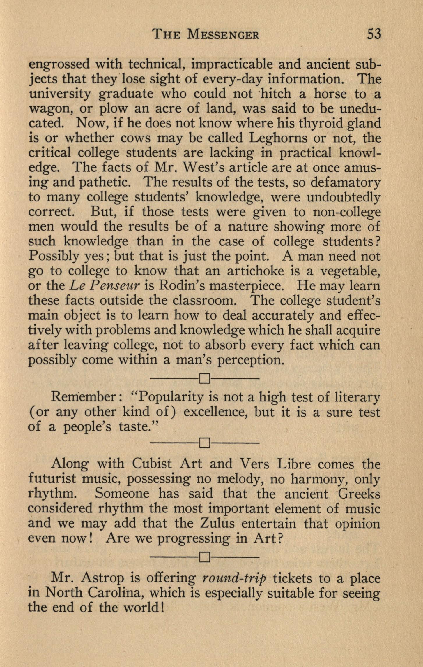 engrossed with technical, impracticable and ancient subjects that they"lose sight of every-day information. The university graduate who could not ·hitch a horse to a wagon, or plow an acre of land, was said to be uneducated. Now, if he does not know where his thyroid gland is or whether cows may be called Leghorns or not, the critical college students are lacking in practical knowledge. The facts of Mr. West's article are at once amusing and pathetic. The results of the tests, so defamatory to many college students' knowledge, were undoubtedly correct. But, if those tests were given to non-college men would the results be of a nature showing more of such knowledge than in the case of college students? Possibly yes; but that is just the point. A man need not go to college to know that an artichoke is a vegetable, or the Le Penseur is Rodin's masterpiece. He may learn these facts outside the classroom. The college student's main object is to learn how to deal accurately and effectively with problems and knowledge which he shall acquire after leaving college, not to absorb every fact which can possibly come within a man's perception.